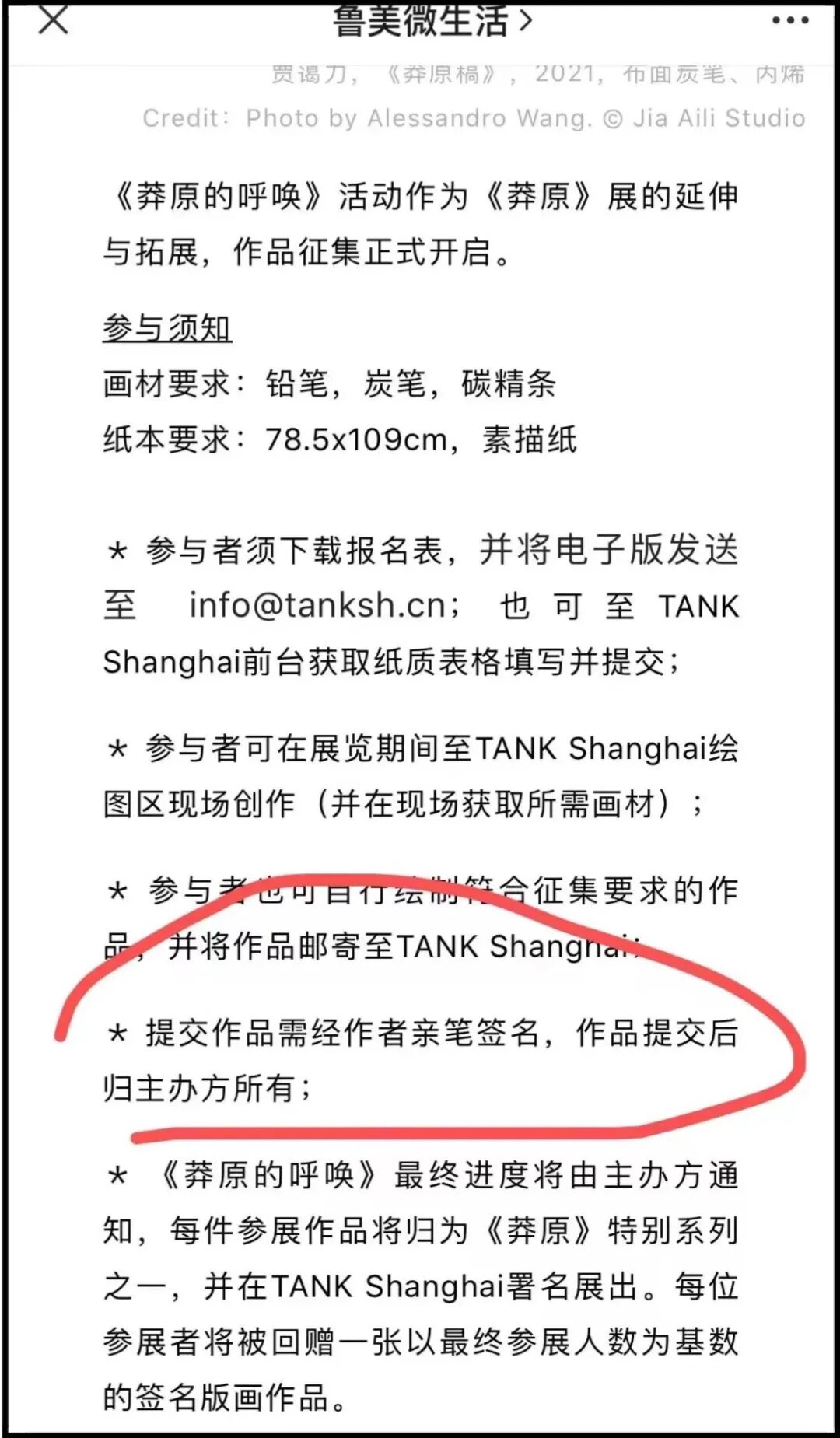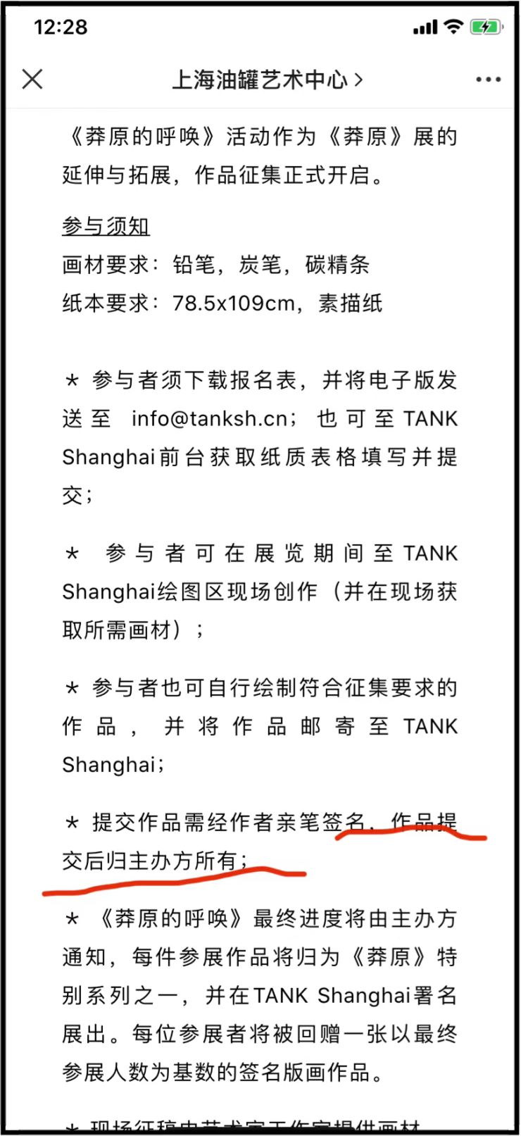 但是后续索要作品归属的行为,就让人觉得思路清奇了。这么自我感觉良好的艺术机构怎么会希望无偿拥有参展作品呢?是因为觉得自己店大有钱,还是觉得自己代表艺术学术权威,还是其实压根就看不上所谓陪玩的玩意儿?不过我估计参加这个活动的艺术家应该都会认可前两点。