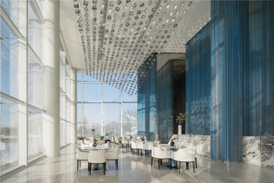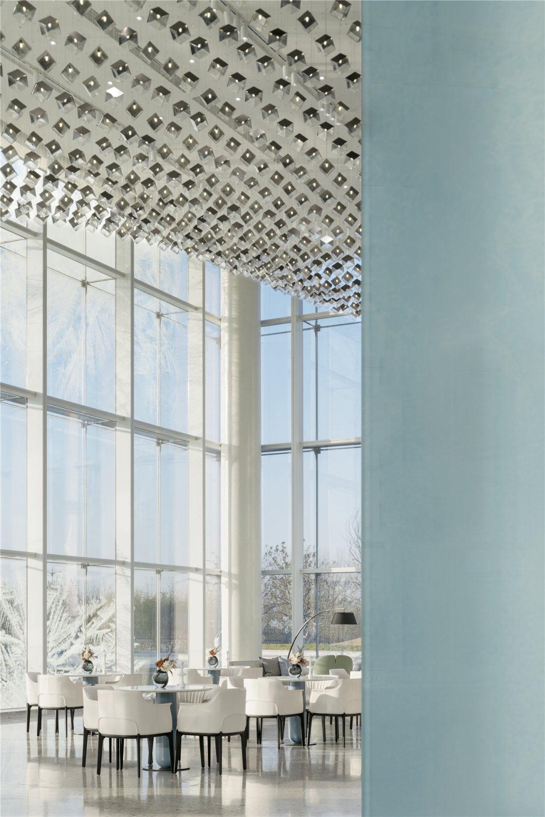 步入一层的湖景大厅,纯净的白色瞬间俘获人心,带来宁静的舒适观感,利落的线条与莹白的灯带相映成画,勾勒出空间的干净与秩序。蓝白相映的光圈,于纯白的“冰雪”空间点缀出仿若极光的绚烂,带来极强的艺术张力。