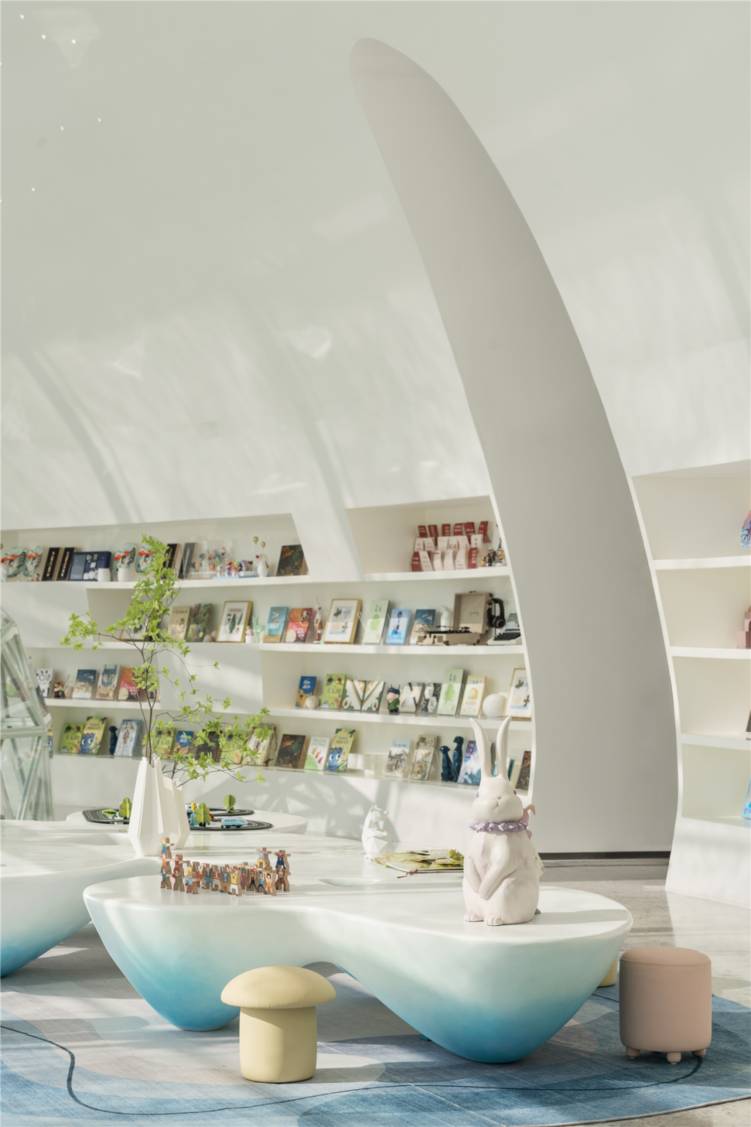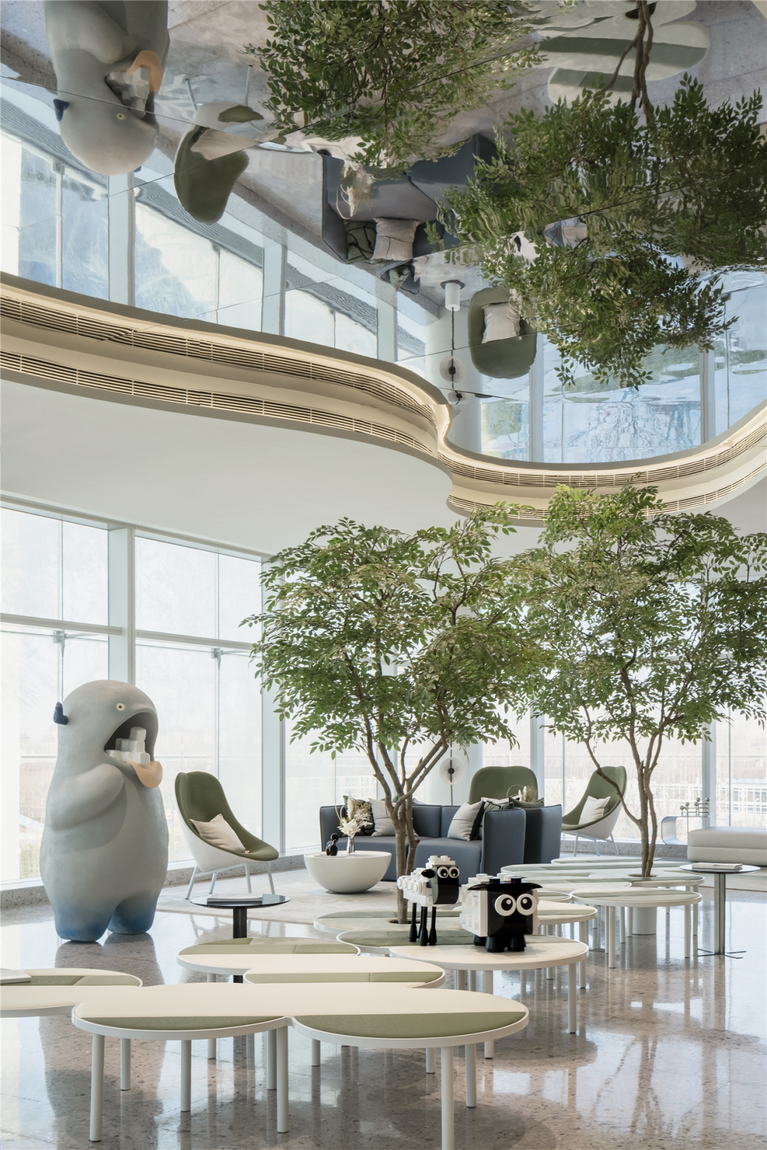 悦目绿色尽情描绘,不规则的绿色地毯蜿蜒于儿童游乐区,积木桌椅与可爱萌趣的绵羊摆件点缀其上。蜿蜒的天花镜面宛若湖面水波静静流淌。