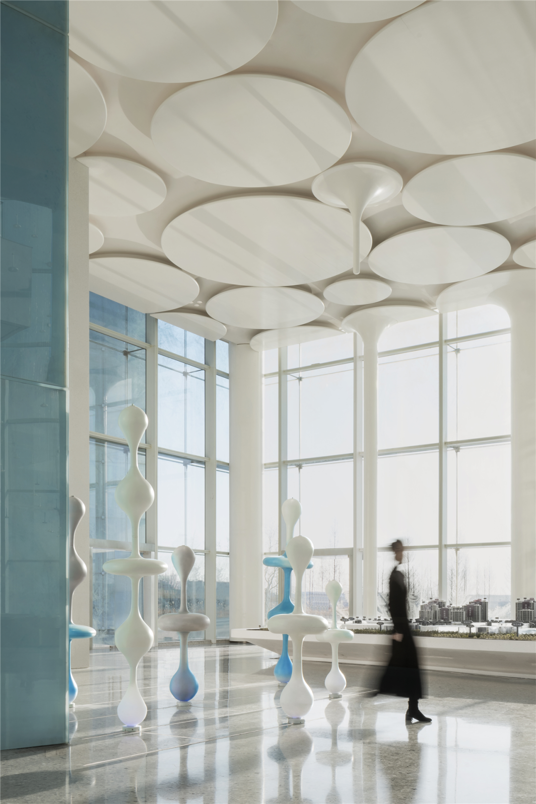 沙盘区运用不规则的椭圆吊顶与立柱,打造出奇幻冰原的雅致景观,以简约的灯带勾勒天花造型,四周通过细小的孔洞散射光线,无形的光影纳入空间。
