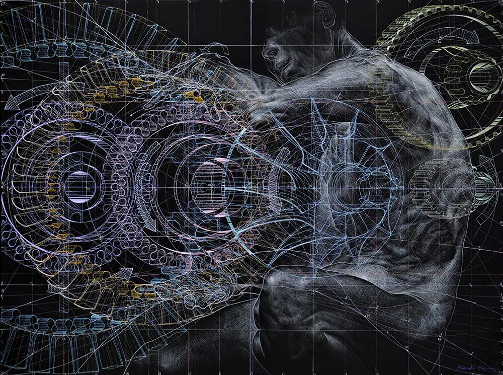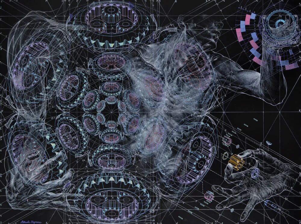 METAMACHINE是他在视觉艺术和电子音乐边界的合作项目。尽管小山笃志的这些油画作品背后的含义有些模糊,但我们很容易欣赏到他的画笔的精确性,它多彩而优雅地描绘了机械图与解剖学插图的混合。