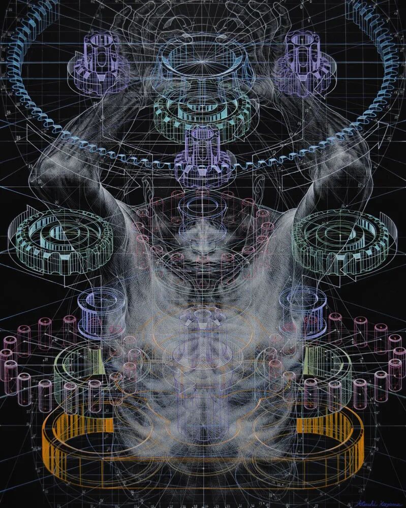 小山的作品明显运用了他的专业背景,他将解剖学插图和机械图完美地融合在一起。