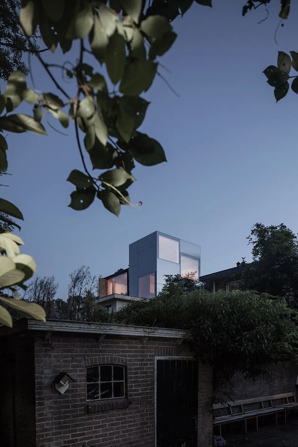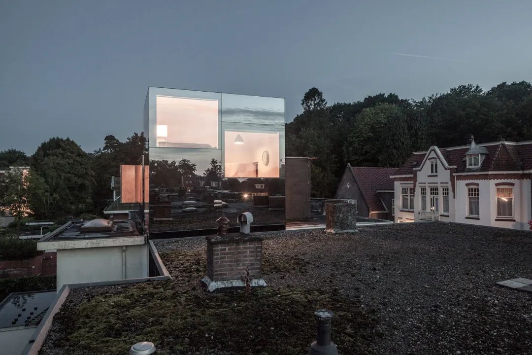 镜子屋是一个建造在一座荷兰小城市的屋顶延展装置。这个装置的安置主体是一个12岁男孩的卧室。设计采用树屋的理念,旨在建造一个空中的私人空间。理念设计中的钢床浮于屋顶三米高处。这里可以俯视周围的房顶,烟囱,花园和树木。