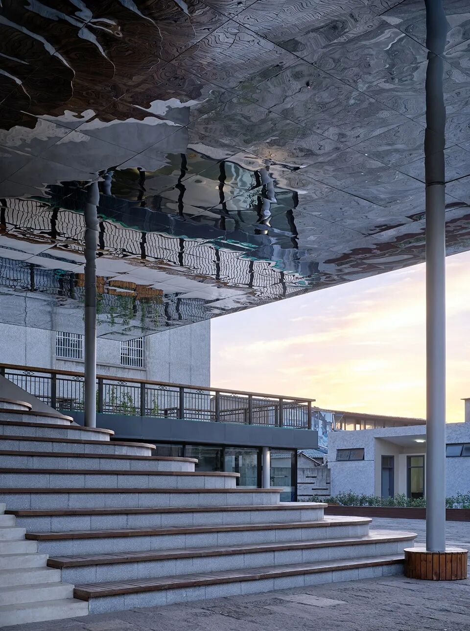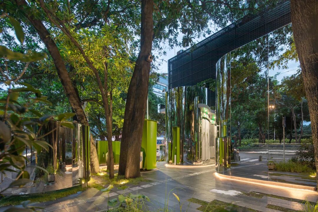 设计在立面上采用8K镜面不锈钢材质,其外观随着光线的更替,四时的变化呈现出不同景象。建筑与周边的景物交织在一起,既和谐地共存着,又似消隐于树林掩映中。