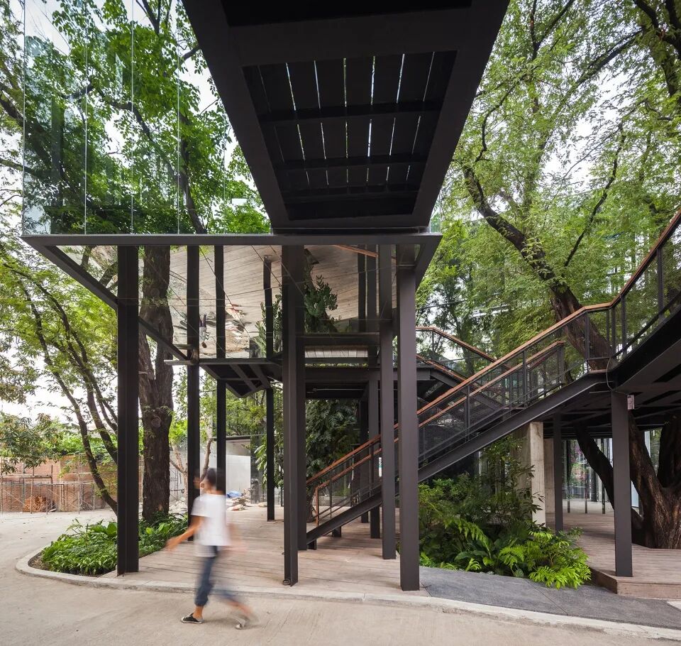 该项目共涵盖2000平方米的办公及零售空间,分为A栋和B栋两个主要的体量,并分布在场地两边,为中间留出以树为核心的开放式庭院。