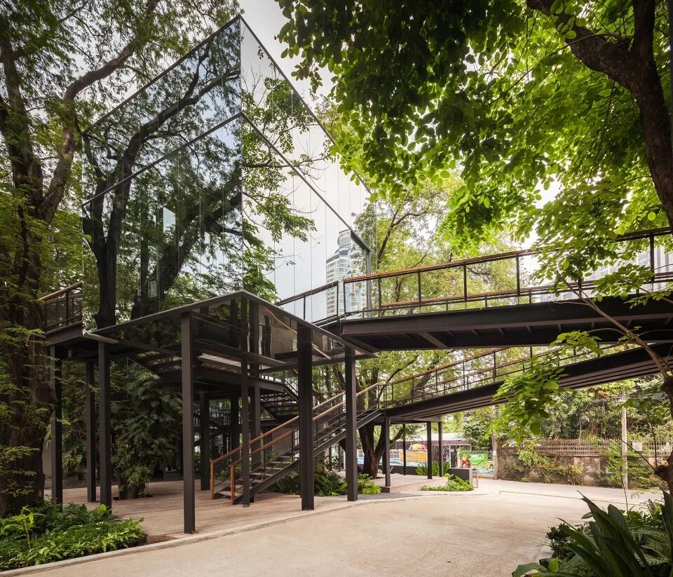 该项目的名称源于其隐藏于森林中的设计思路,环绕在建筑四周的反射玻璃使葱郁的环境得以扩展。