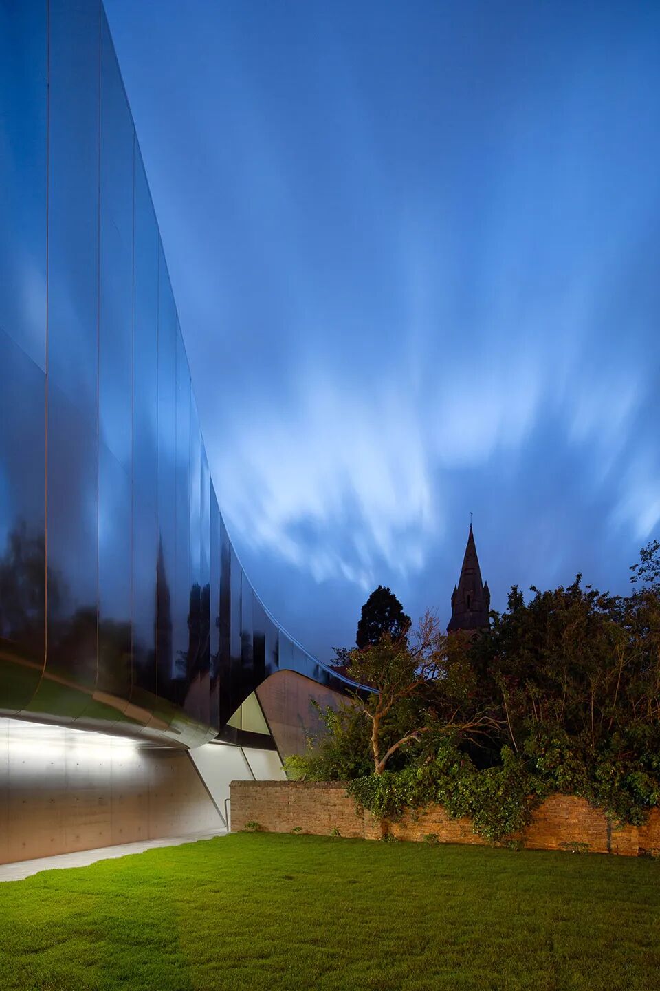 它蜿蜒穿过圣安东尼学院内限制建设的节点,把历史保护建筑和古树名木连接整合起来。立面不锈钢的镜面材质柔和地反射自然光线,回应着周围的建筑肌理。