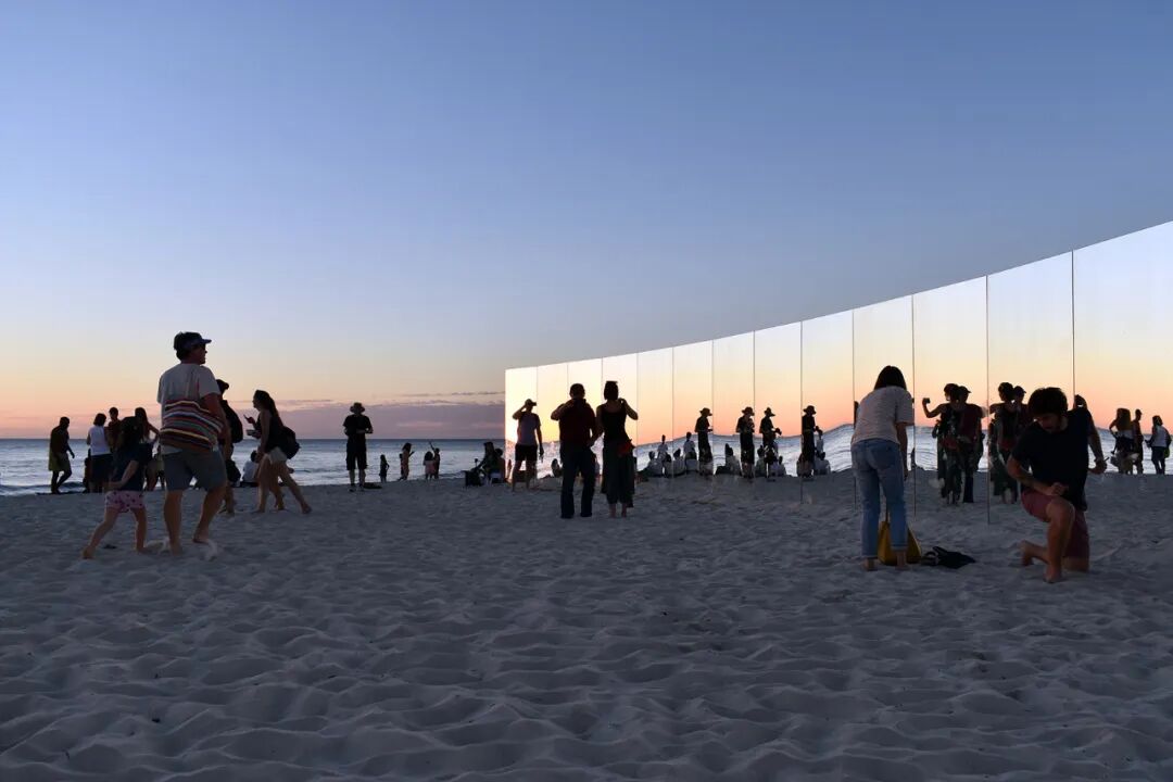 该曲面镜面墙以直径为60米的圆为原型,将广袤的印度洋景观映射在自身。弯曲的镜面将沙滩向远处延展,海平线在镜面上浮动,让人仿佛置身于一座孤岛。