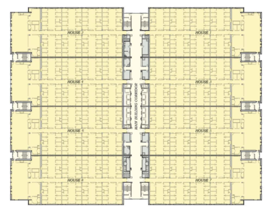 宿舍的九层住宅楼层中的每一层都有八间“房子”,八间独立的“套房”围绕着一个公共厨房和起居区组织起来,顶层将设有一个占地一英亩的庭院,里面有“社交吊舱”和休息区。