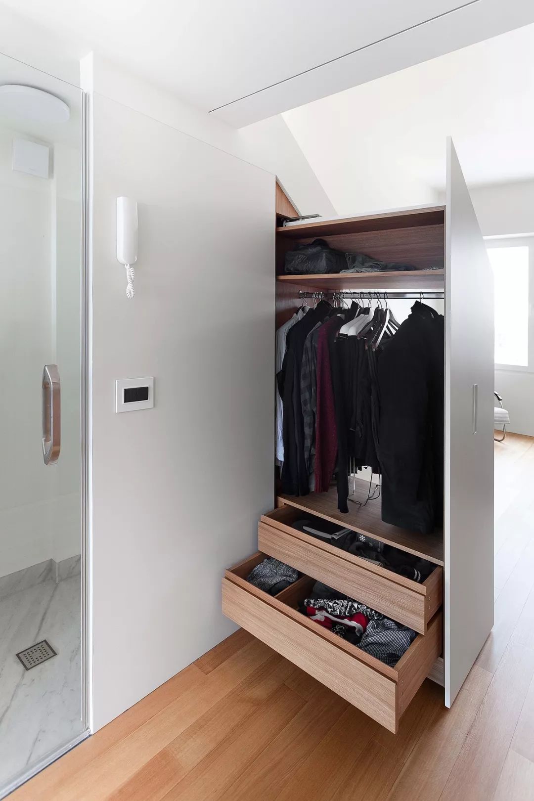 对于小LOFT来说,楼梯下斜斜的空间一般用作储藏室太过可惜,它可是绝佳的改造位置。稍微用点小心思,就能拥有一个别有洞天的衣帽间哦!