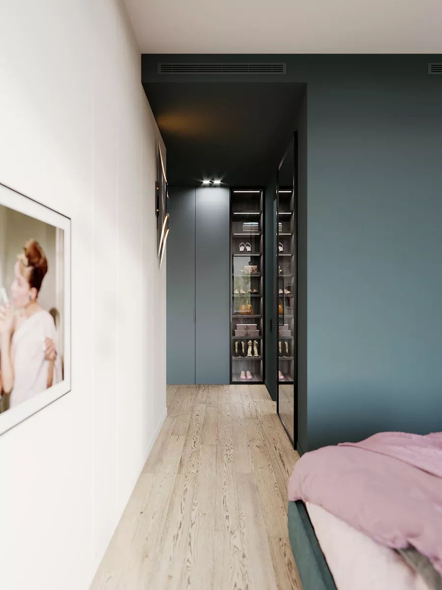 你可以选择更改门的位置,改变进入卧室的方式。将衣帽间设计在卧室里,更具有私密性。将衣帽间设计在卧室外,则更像家人共用的区域。