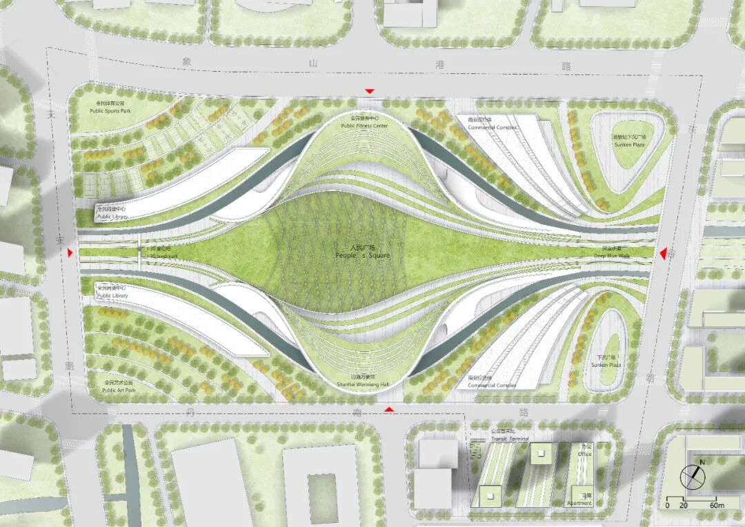 象山人民广场建于上世纪90年代,是一个既热闹又乡土的存在,浩浩荡荡的广场舞人群,蹦蹦跳跳的象群雕塑和笨拙可爱的大鱼铺地,以一种粗糙又热烈的方式宣告这里就是象山。策划将人民广场片区定位为“想象力之心”,将变成集人民广场、全民健身中心、山海万象馆、全民阅读中心、i30象心塔、TOD商业综合体、深蓝步道、未来社区为一体的公共中心,“这里将不仅有美好生活,还能瞥见海洋和地球、星空和宇宙”。