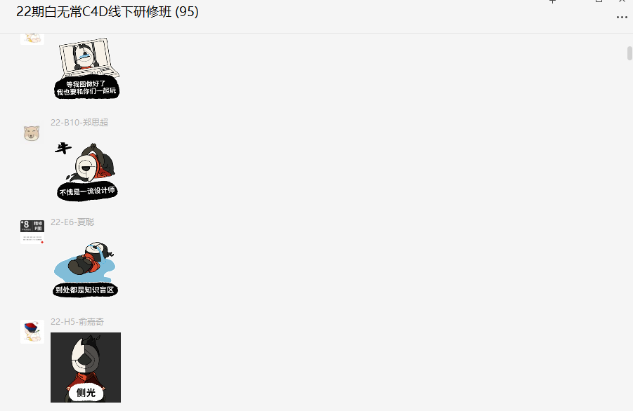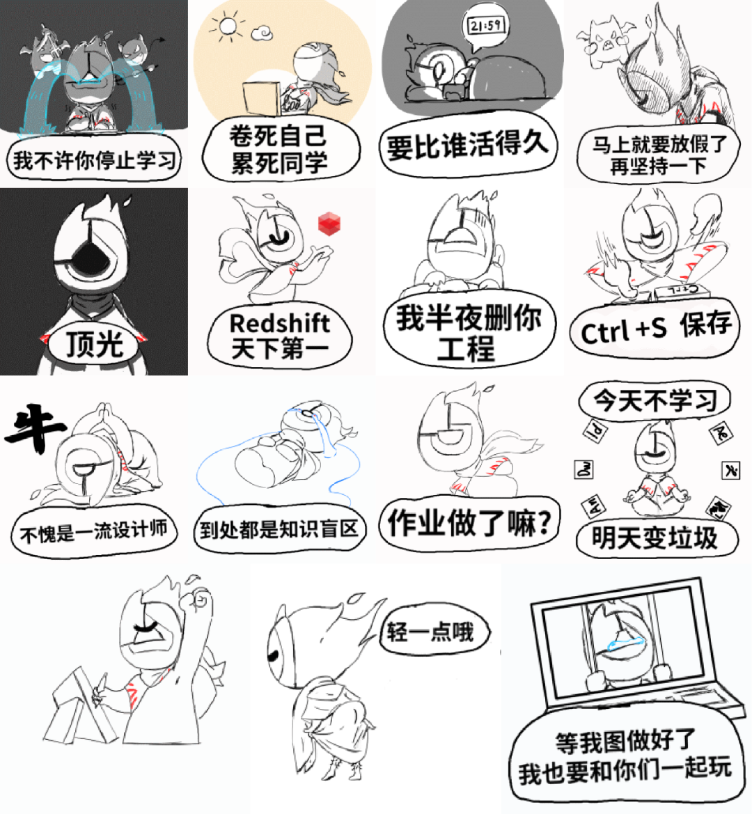 以下一共是16个表情包,有关设计的,有关学习上课的,还有一些比较日常的~