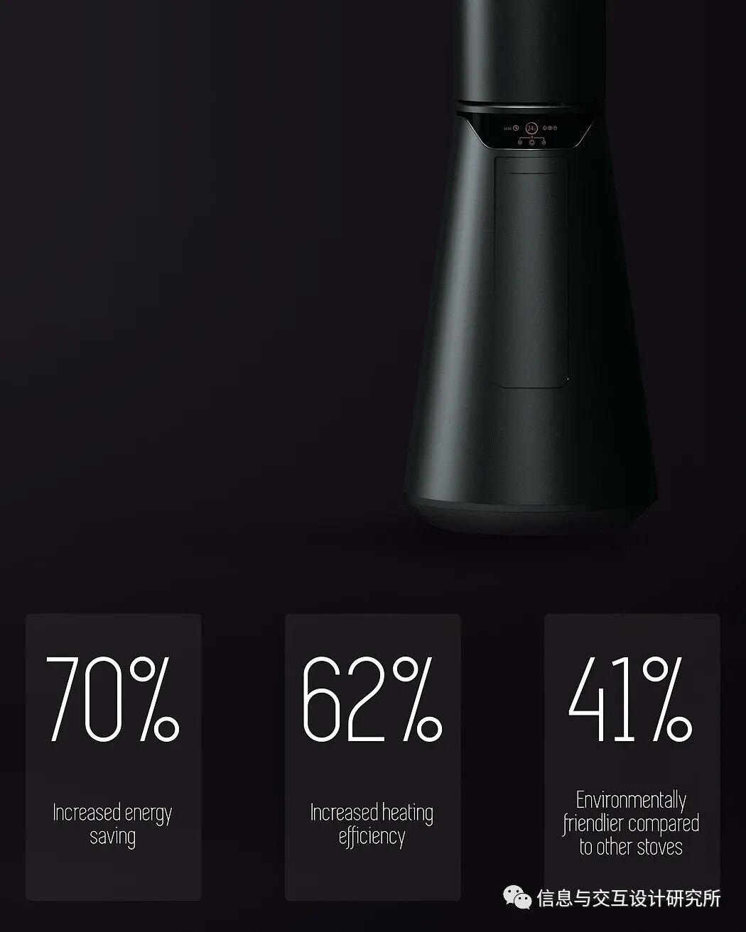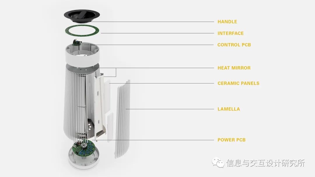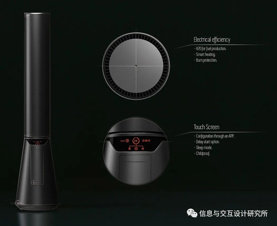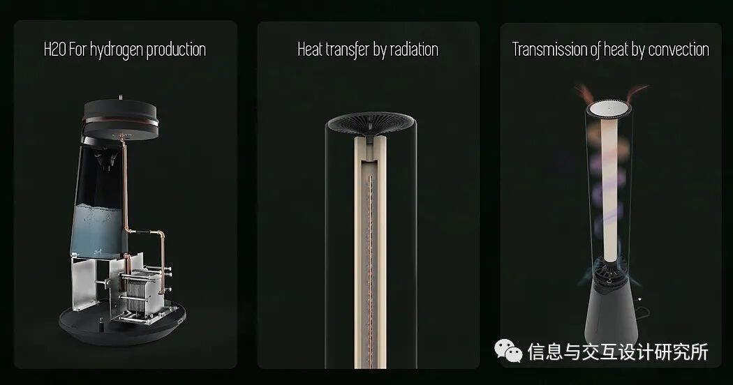 该设计通过电解产生热能,破坏水分子中的键,然后燃烧分离的氢,热空气沿着产品外部上升,利用其上部分配的通风,通过对流释放热量。最特别的地方是,由耐火陶瓷制成的核心即使关闭也能散发出温暖。