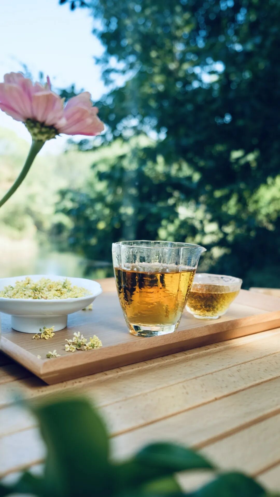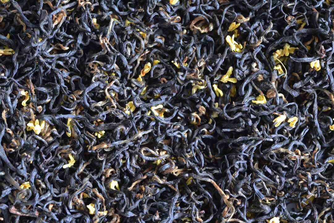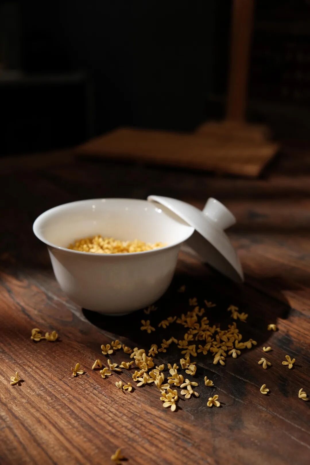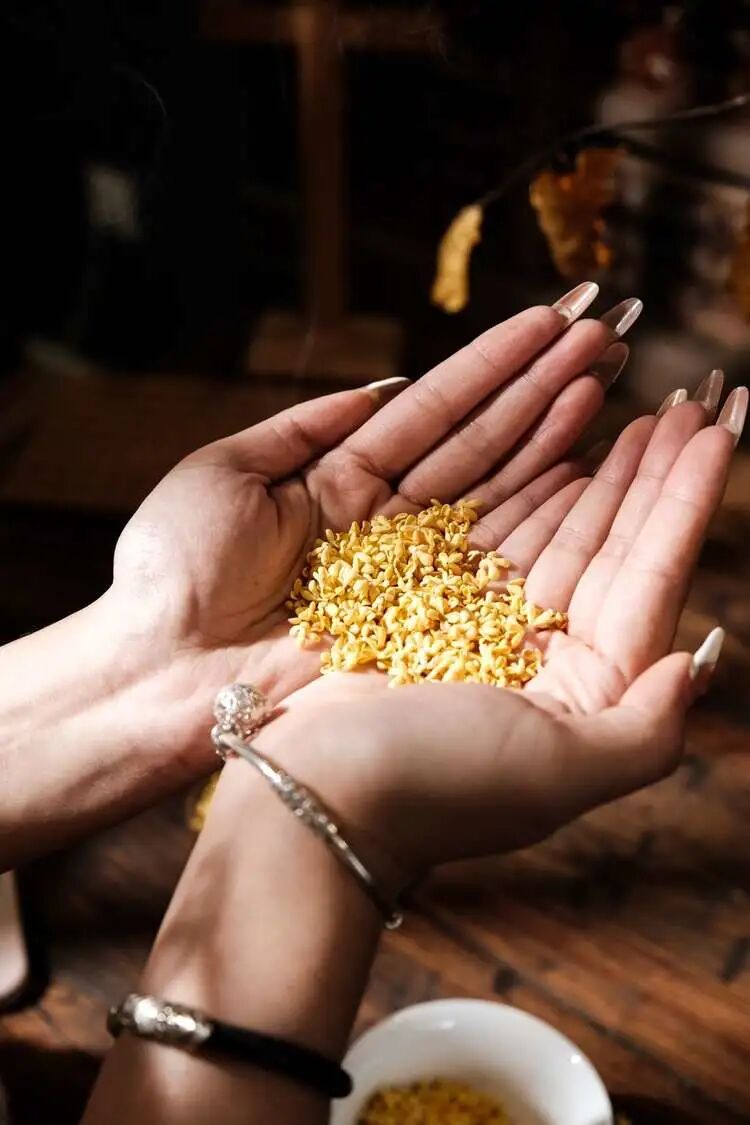 人们采摘新鲜初放的桂花与茶坯铺呈展开