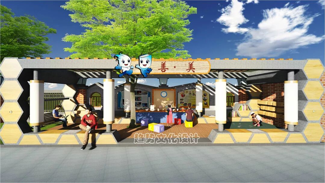 善道的六边形造型,由“蜂巢”结构提取而来,寓意孩子们在此处就餐、休憩,犹如蜜蜂回巢般温暖。蜂巢造型的廊架,让孩子们在休闲廊架中感受父母的辛劳,让其学会感恩,体会父母的艰辛。