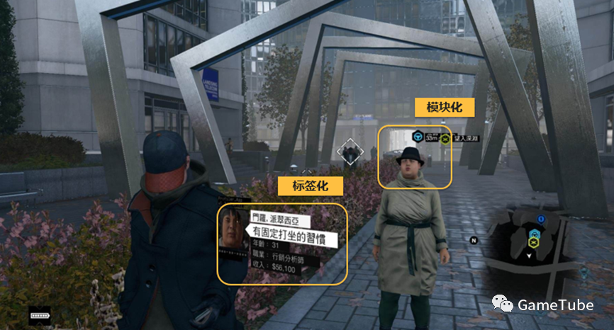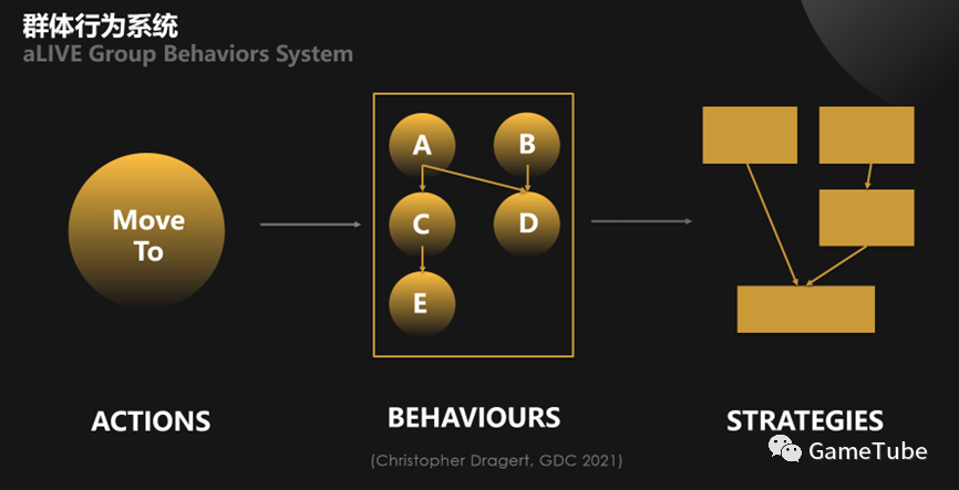 群体行为在游戏中随处可见。包含角色对话,挟持人质,扣留平民,超出职权的压迫行为,暗杀,抢劫,勒索,大型抗议活动。透过模块化和抽象化管理,而非具体的特定行为,重用模块化的功能,像是给NPC打一个标签,再进行定义,这个标签下的NPC都有固定几个行为,然后再把这个行为封装到比较模块化的功能里,让大家更方便地调用,而不是每次做一个NPC都再写一个新的交互行为或表现流程(Christopher Dragert, GDC 2021)。