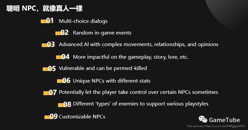 怎么说呢? 最主要的交互设计是在NPC的互动上考虑了这几个要素:1.多项对话选择;2.随机的游戏事件;3.具有复杂动作、关系还有观点的高级AI;4.对游戏玩法、叙事等更有影响力;5.可以被永久杀死(独特性);6.永有不同属性的独特NPC(拥有不同属性Tag);7.有时候让玩家控制某些NPC,像是在某些任务中;8.不同类型的敌人可以支持不同的风格;9.可被制定的NPC。