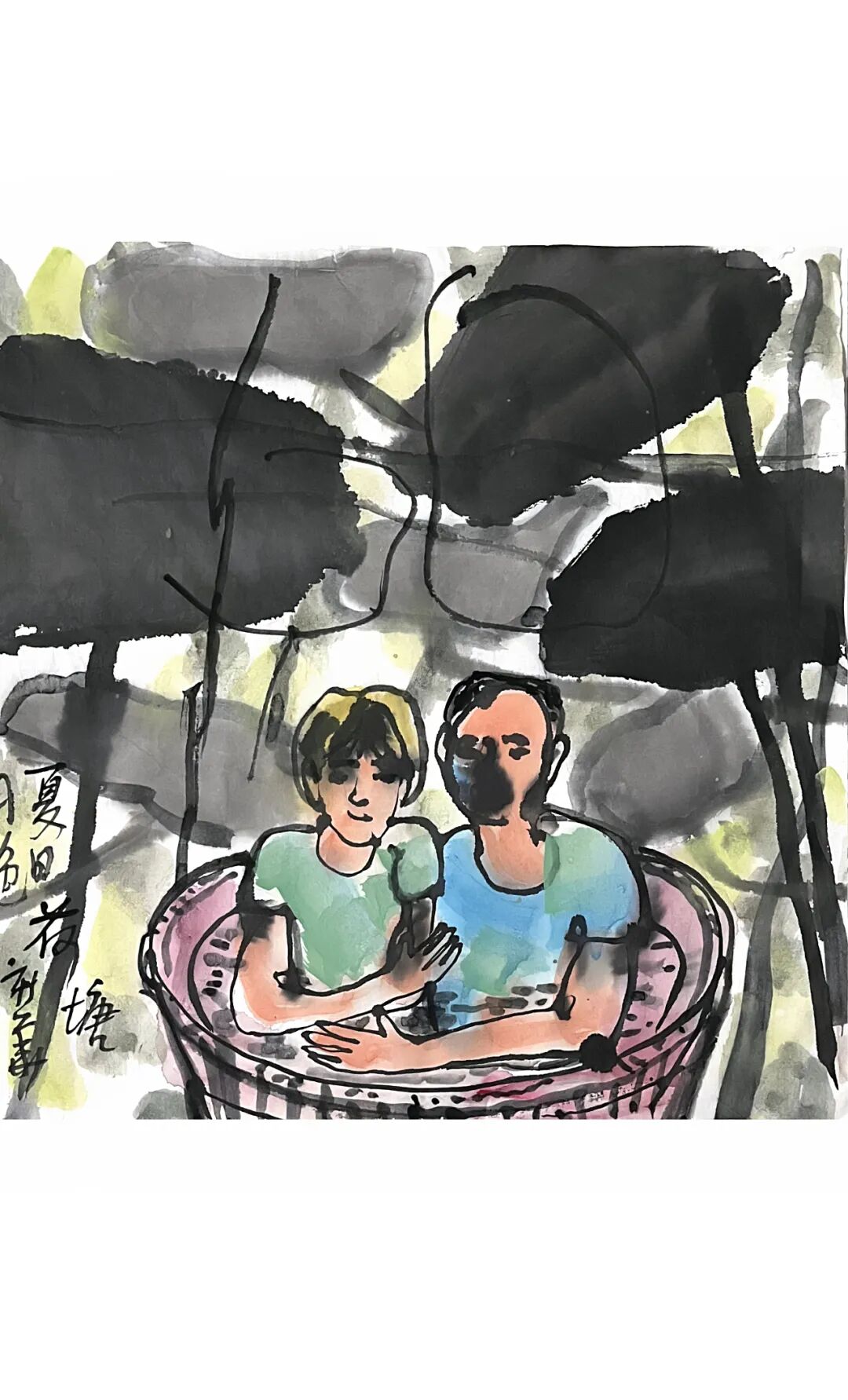 也可以把水桶搬到荷塘里。赏景乘凉两不误。