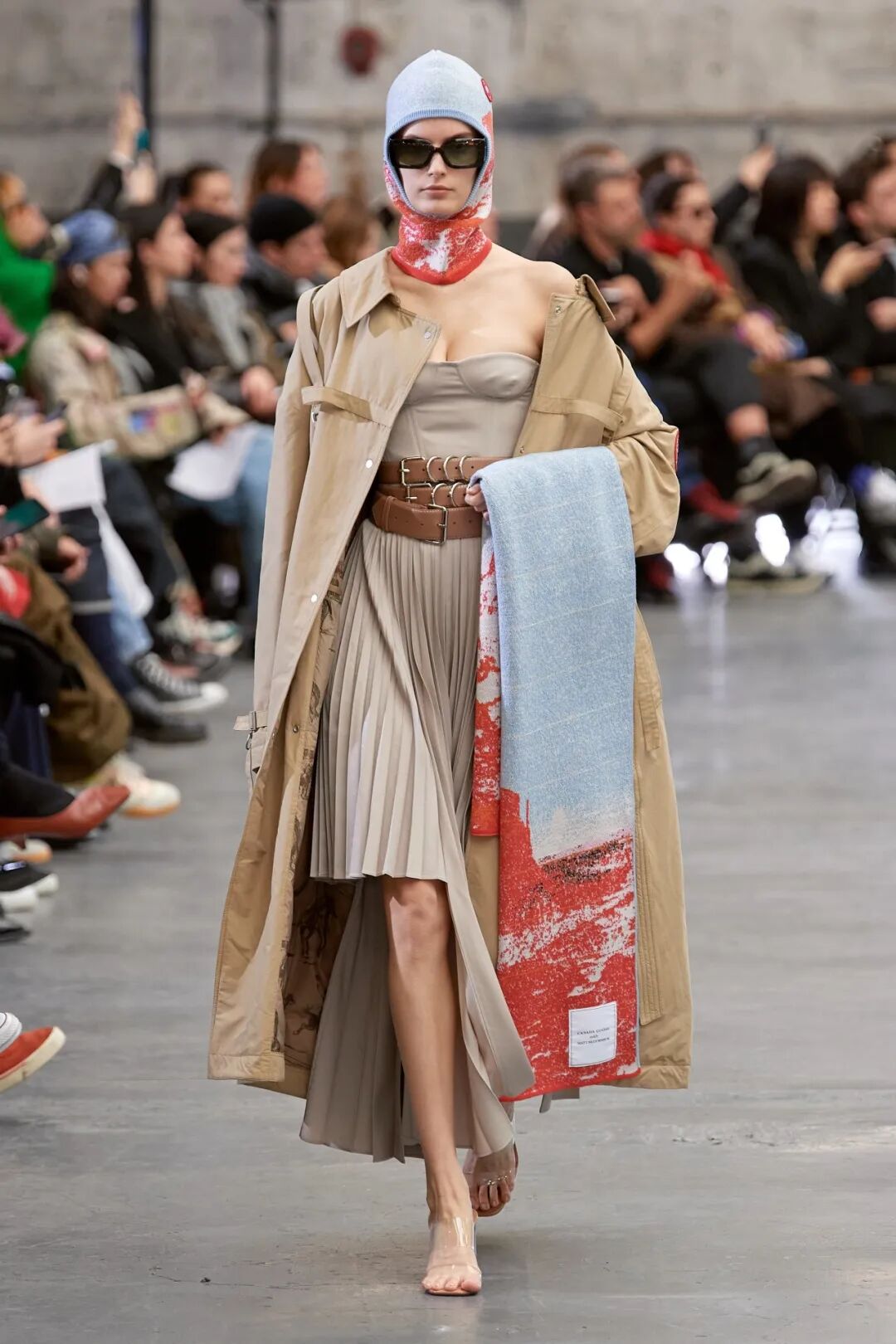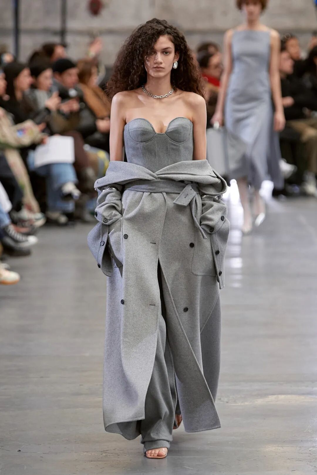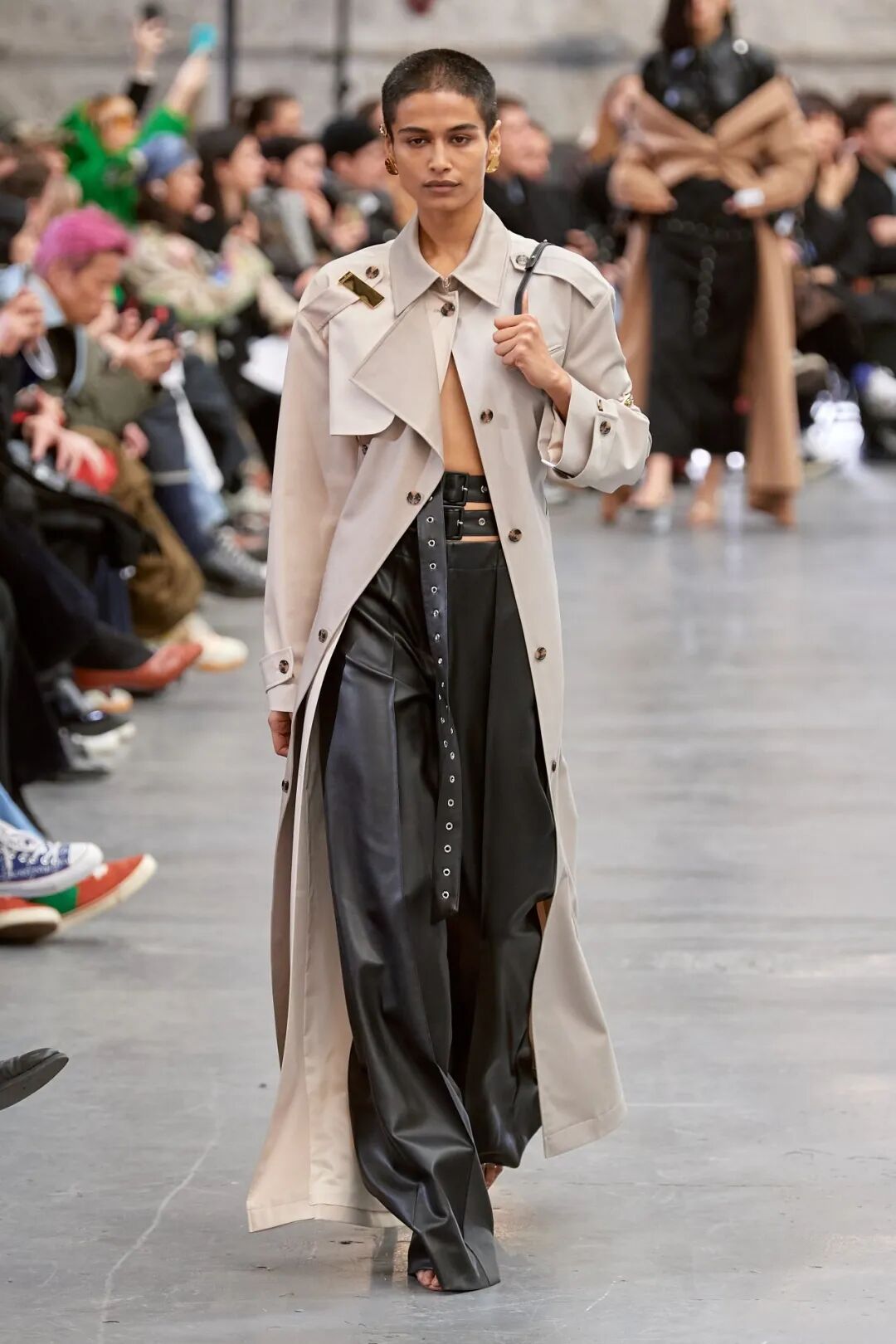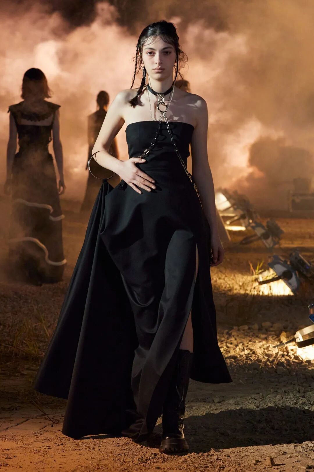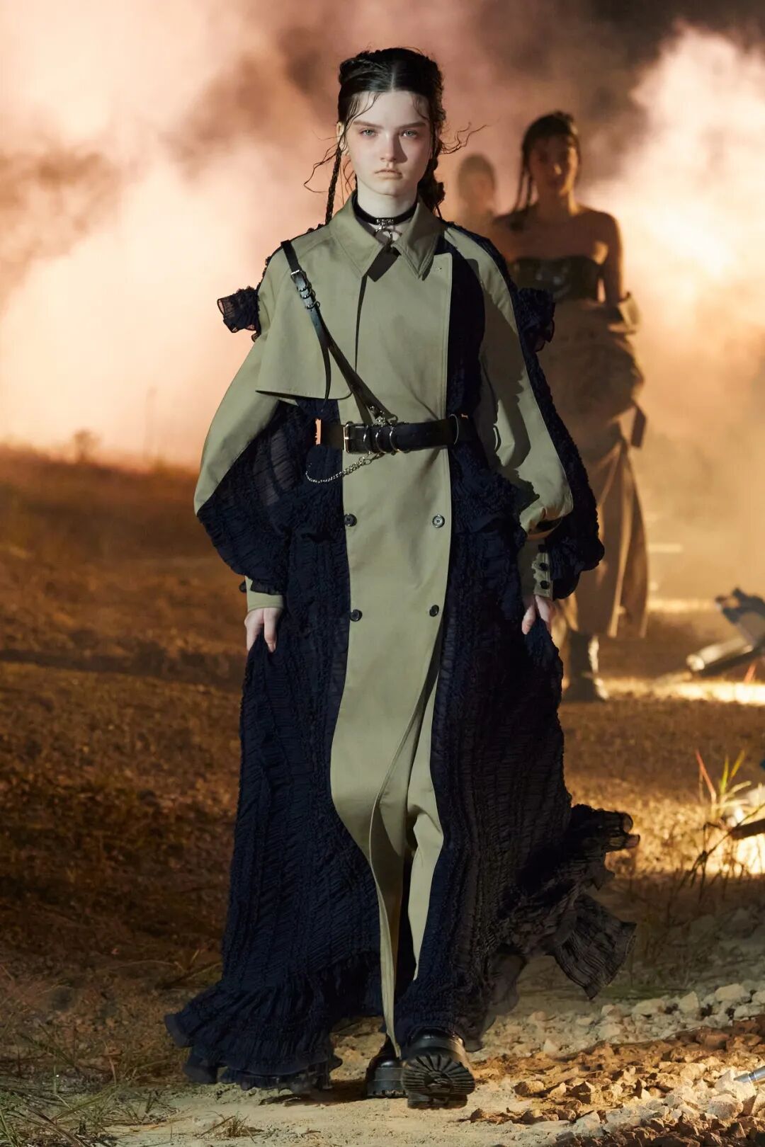叠穿扭曲的风衣和多层的裤腰,延续了Rokh的品牌基因,对于解构和面料材质对比的熟练运用。往季中常见的金属部件和多条装饰的腰带,在本季依然在整个系列的服装展示中占据着大众的视线。