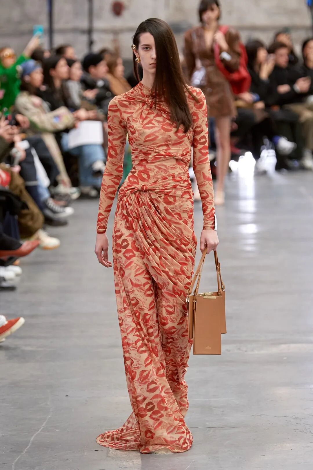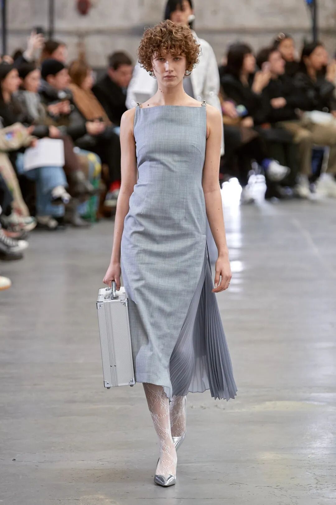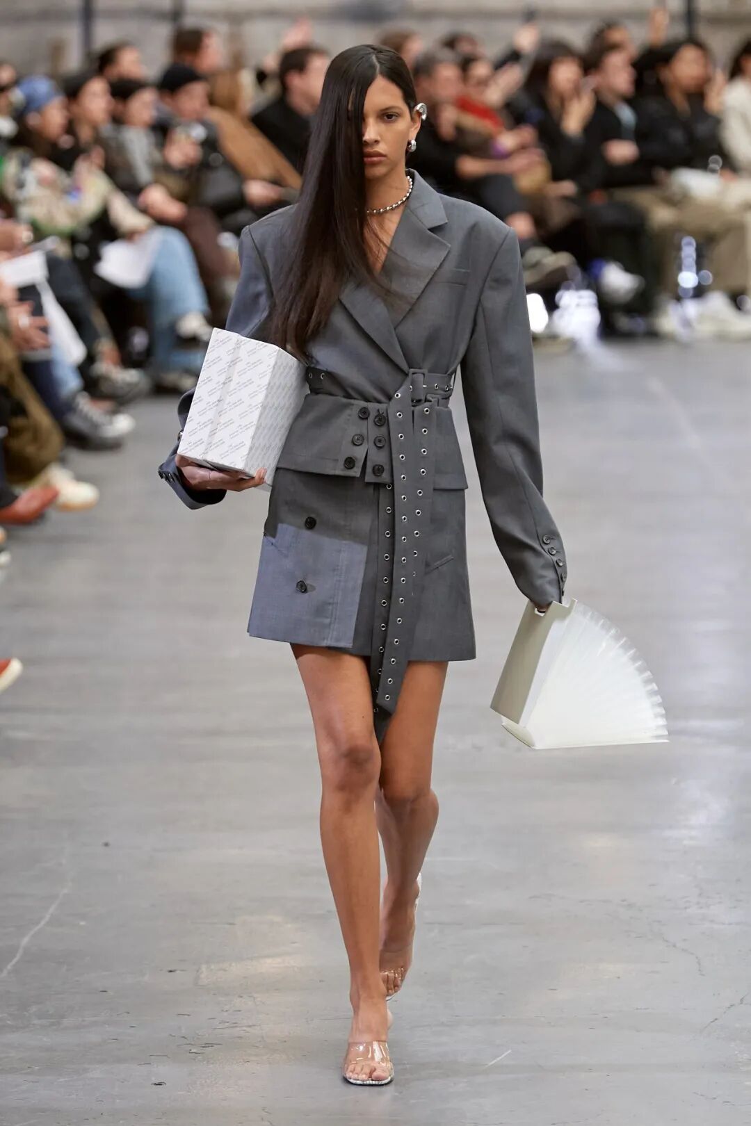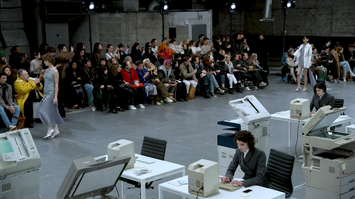 2023秋冬成衣系列以Office Essentials为主题,秀场中心布置了办公室的场景,模特们手拿文件夹走秀,结束后来到“办公区域”扫描文件、接打电话、继续坐在电脑前边办公。