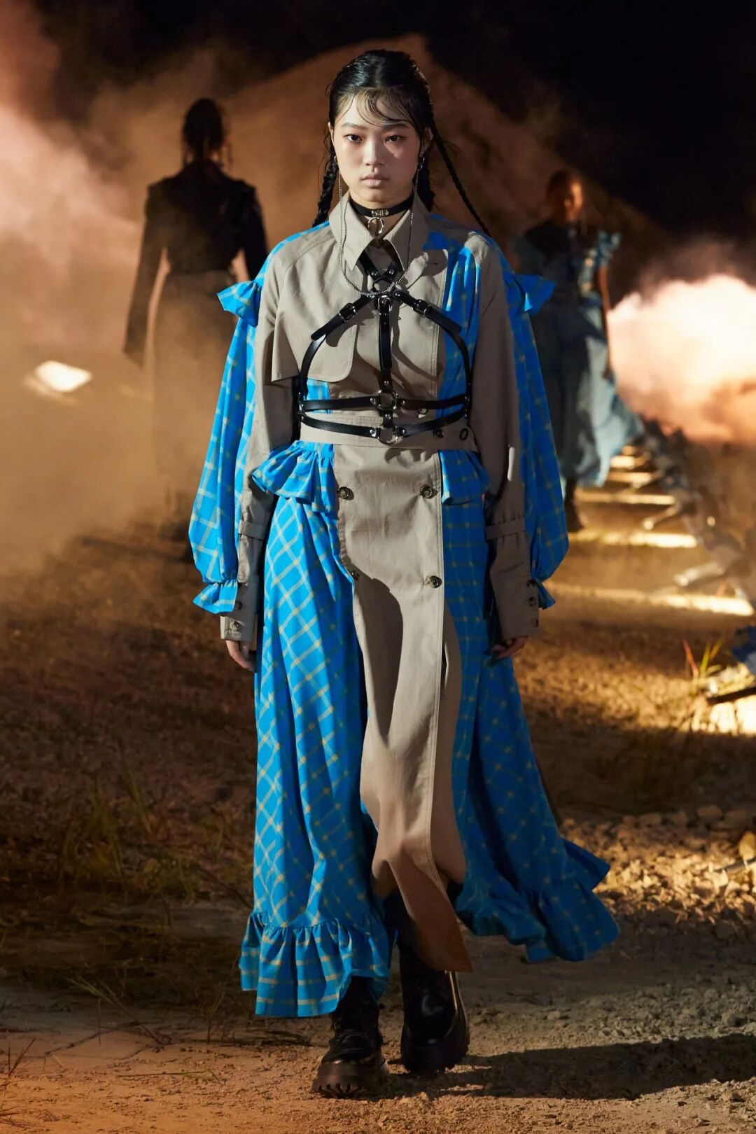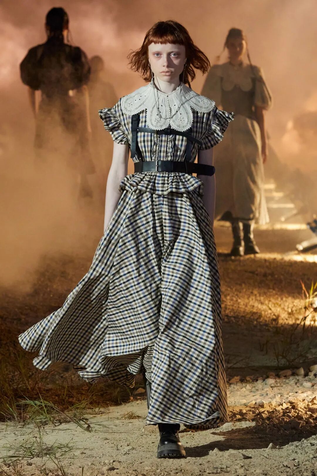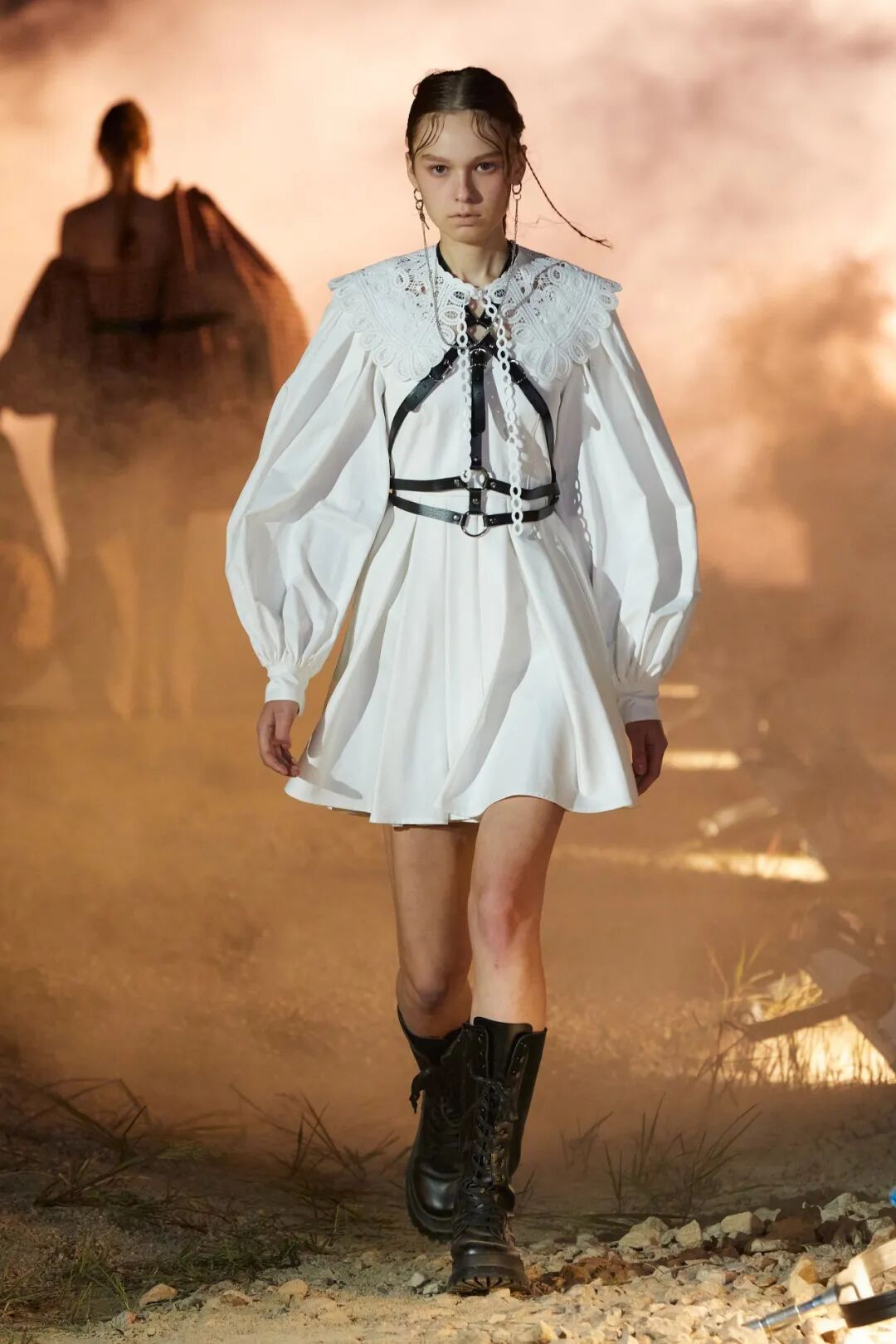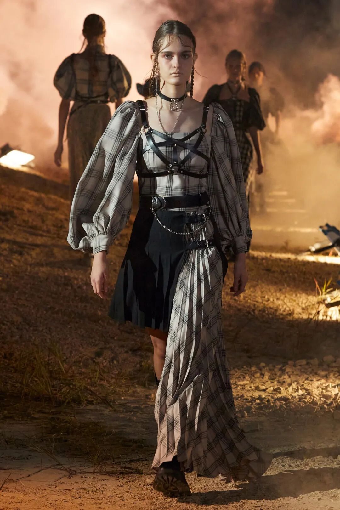 整个系列中,暗黑的哥特萝莉风格十分明显,苏格兰风格的连衣裙、风衣和短裙,蓬松的袖子、夸张的蕾丝和花边领子。我们还是能在细节处看到Hwang惯常使用的皮革腰带的元素,作为外搭,搭配在服装的外边。