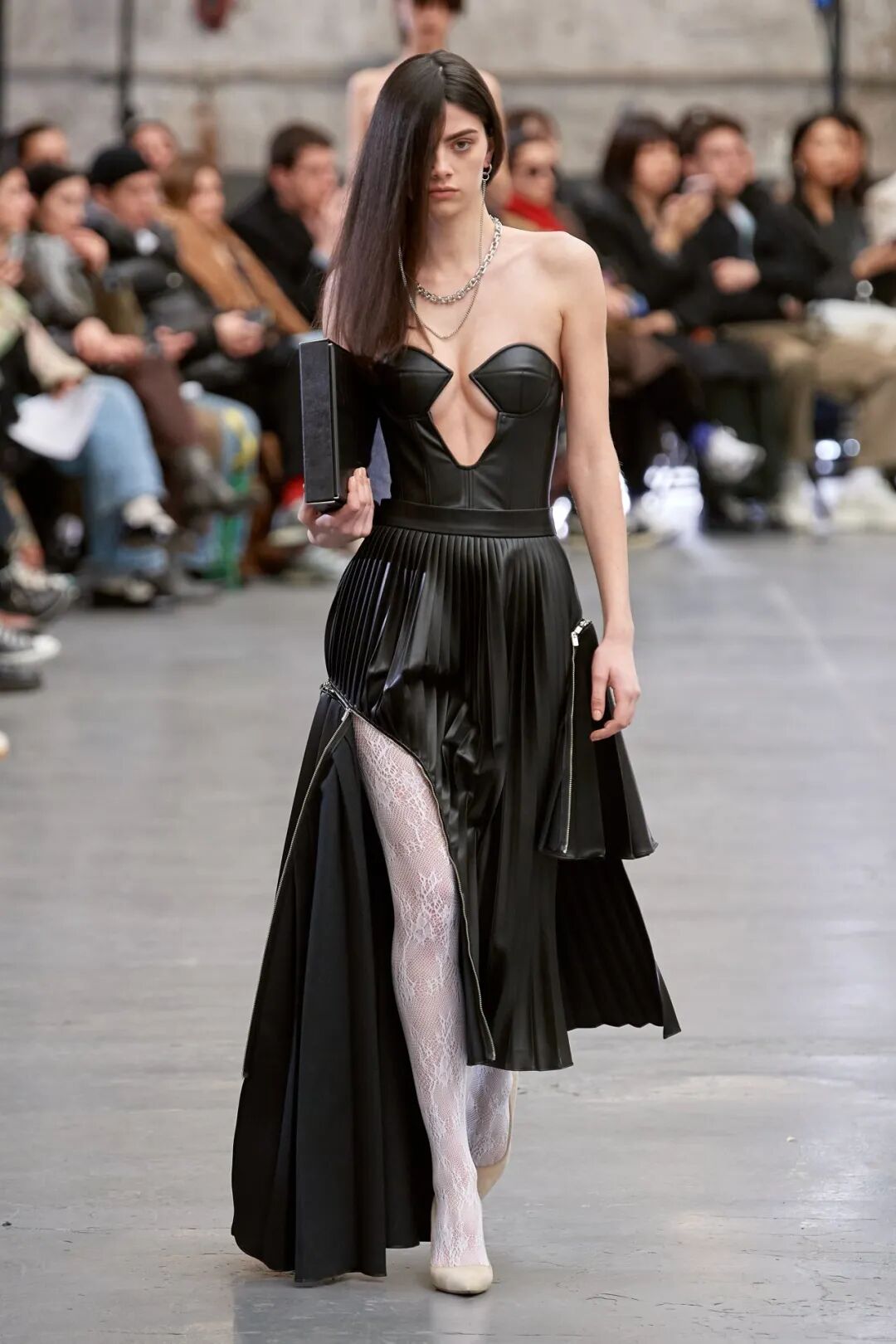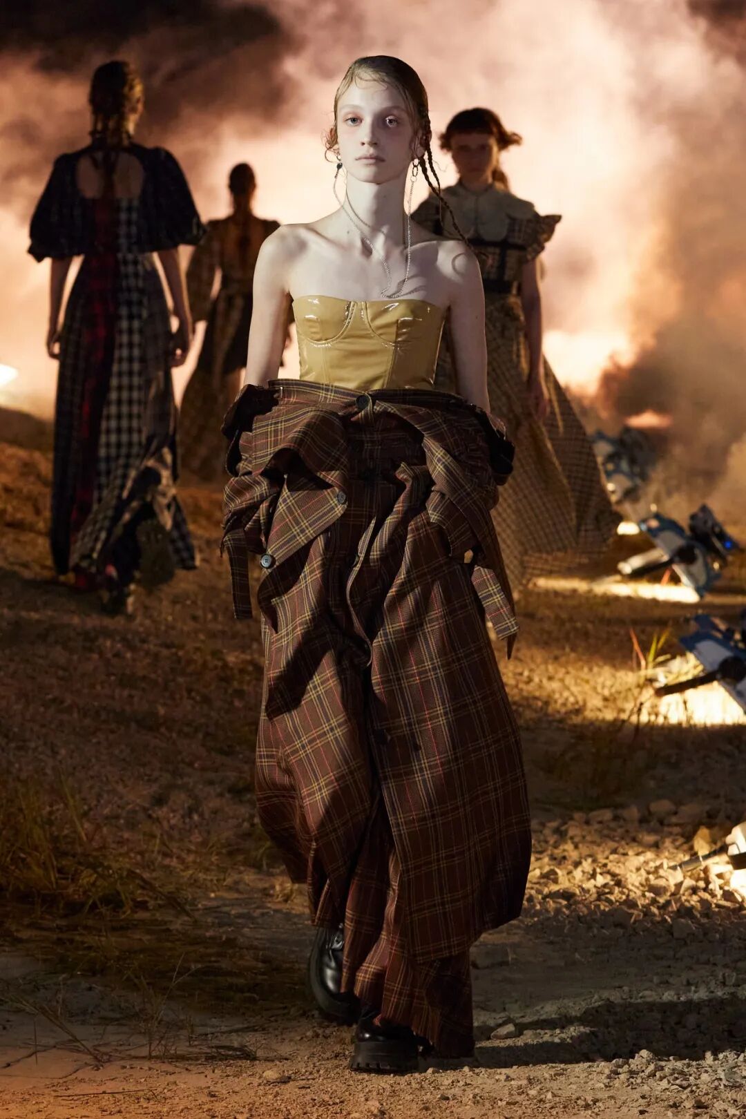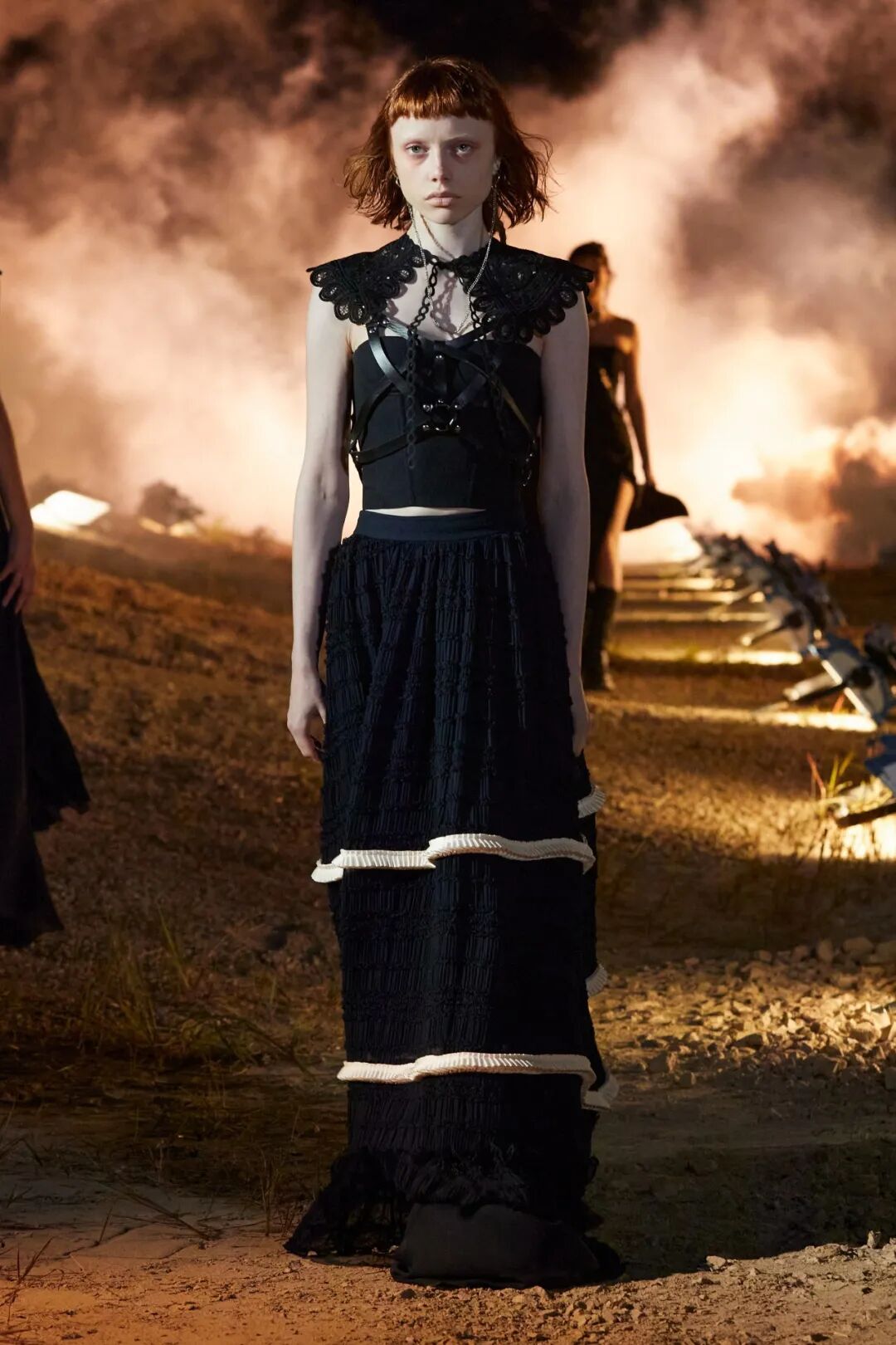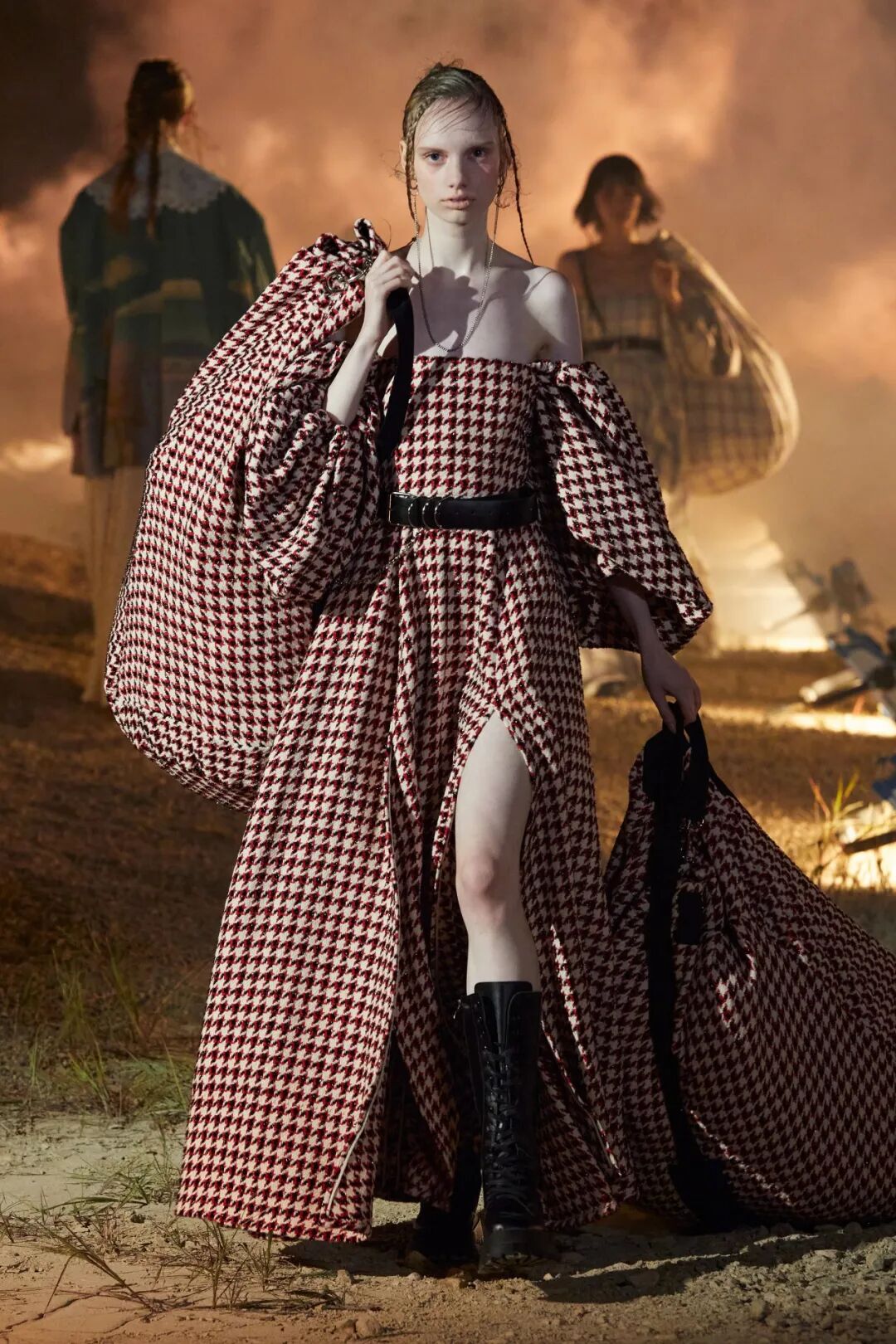 整个系列中,暗黑的哥特萝莉风格十分明显,苏格兰风格的连衣裙、风衣和短裙,蓬松的袖子、夸张的蕾丝和花边领子。我们还是能在细节处看到Hwang惯常使用的皮革腰带的元素,作为外搭,搭配在服装的外边。