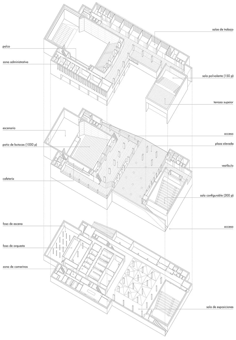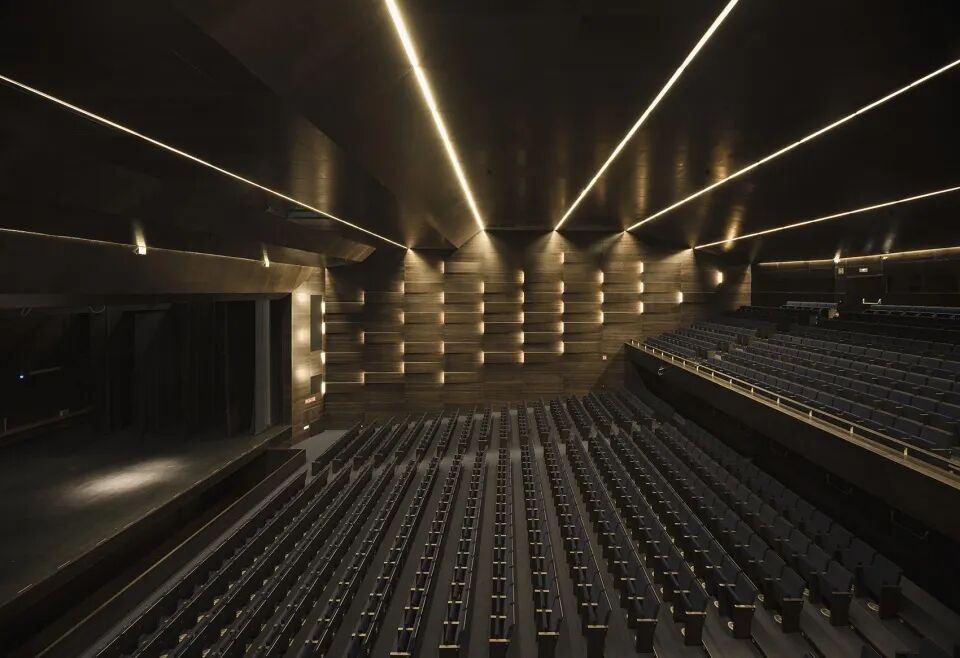 大礼堂位于两个大型混凝土声学大厅的广场的一侧,另一侧则容纳了300人和150人的礼堂,两者在下方由高台连接,高台下是化妆间、坑道、仓库和展览空间。