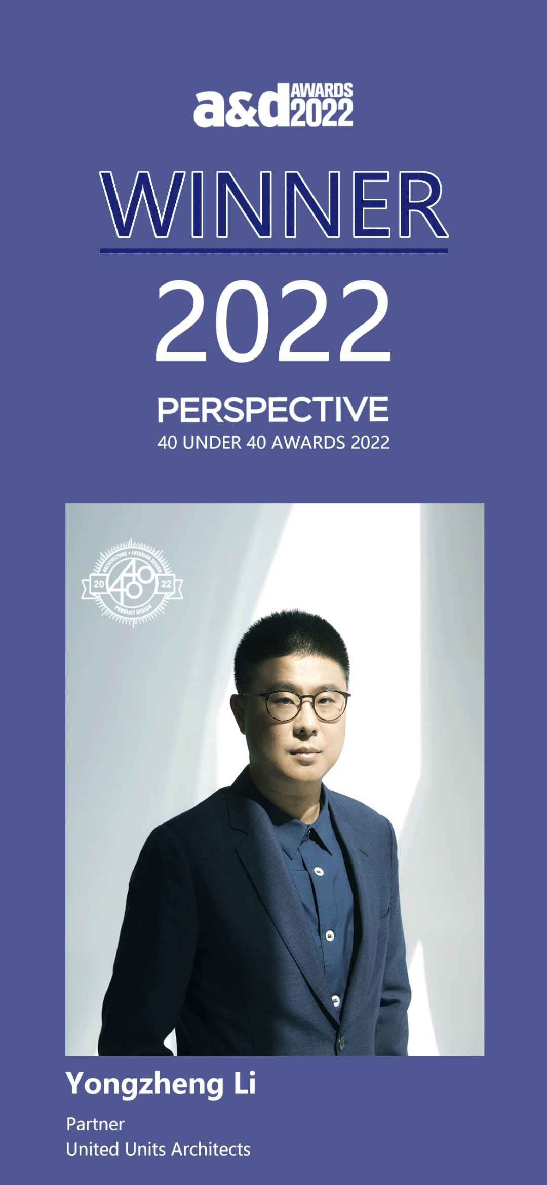 40 Under 40 Awards 由知名杂志《Perspective透视》杂志举办,该赛事于2006年启动,已成功举办14届。作为设计行业最重要的赛事之一,该奖项为设计新秀提供展现自我的舞台。该奖项每年评选出40名40岁以下的优秀设计师,先前获奖者包括MAD建筑事务所创始人马岩松,BIG创始人Bjarke Ingels,AFSO事务所创始人傅厚明(André Fu),藤本壮介( sou fujimoto )等。