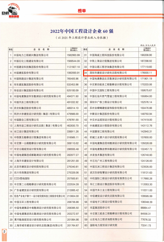 11月26日,美国《工程新闻记录》(ENR)和中国《建筑时报》共同发布2022年度“中国承包商80强和工程设计企业60强”排行榜再次出炉。作为建筑、设计领域的重量级奖项,ENR /《建筑时报》以企业上年度工程设计领域的总营业收入为主要依据,以企业研发成果、净资产、利润率等作为参考指标进行综合评审,在行业内具有较强的影响力、权威性和公信力。据悉,在发布两大总榜单的同时,主办方还根据承包商和工程设计企业上一年度的市场表现,评选出“最具国际拓展力”和“最具效益”的承包商和工程设计企业前十名的分项排名。