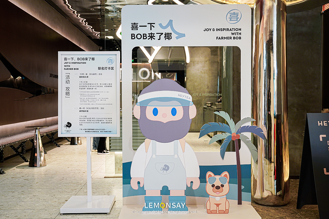 喜茶还结合海边露营的灵感,和FARMER BOB打造了10家主题店。特别设置了四大打卡点:周边陈列台、拍照板、手办展示柜、大头贴机。深圳只有两家哦,罗湖万象城黑金店&海岸城店。