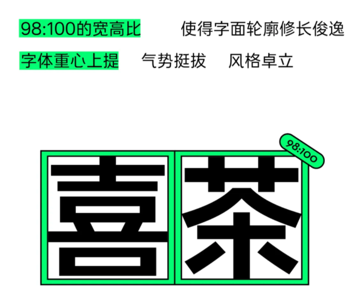 据介绍:喜茶灵感体从简约年轻感出发,“口”字形部件去掉传通黑体的修饰脚,短笔画采用统一的平切方式,长撇捺的笔画连接处理去锐处理,“茶”字的竖钩则更加彻底地简化为线条等宽竖画。