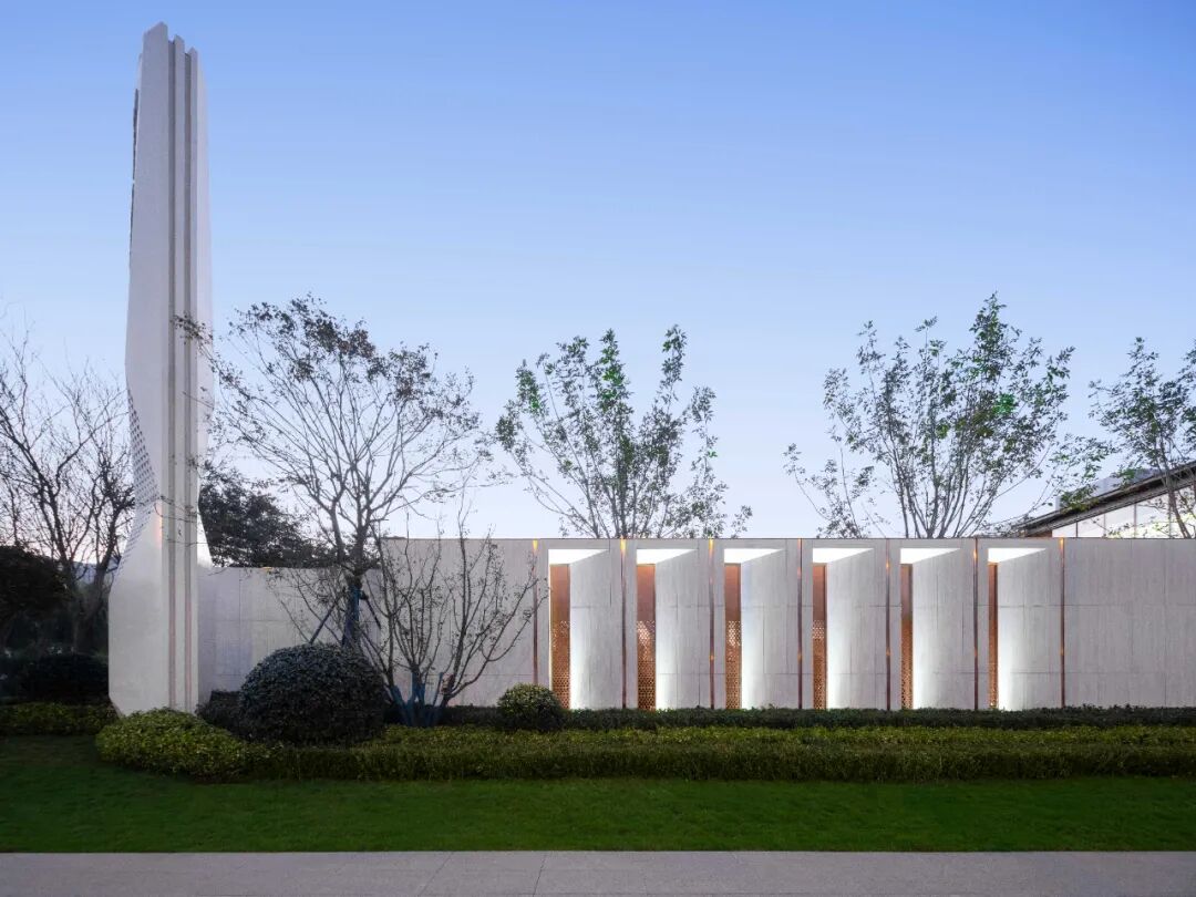 The pedestrian welcoming entrance of the community is the first scene of homecoming and the first step to open the quality of life. The honorable homecoming courtesy makes people feel happy the moment they step into Zhongliang Mansion. Considering the aesthetic feeling, sense of balance and guidance of the overall design of the project, we created a characteristic theme retaining wall with strong guidance in the display interface, which is closely linked with the landscape design and traffic flow line of the site, attracting guests to enter the large area through the exhibition area. The simple installation and the light and shadow of the large wave grating wall create an immersive experience like an art space.