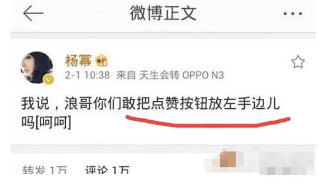 “手滑大王”杨幂大大也一度发微博,建议微博把点赞放在左手边。