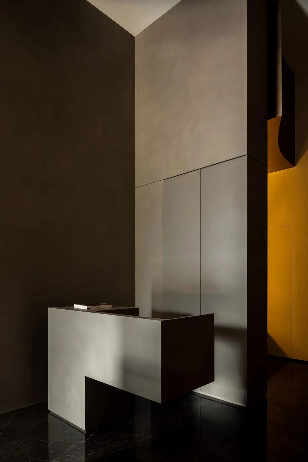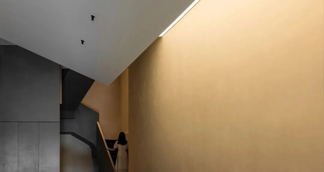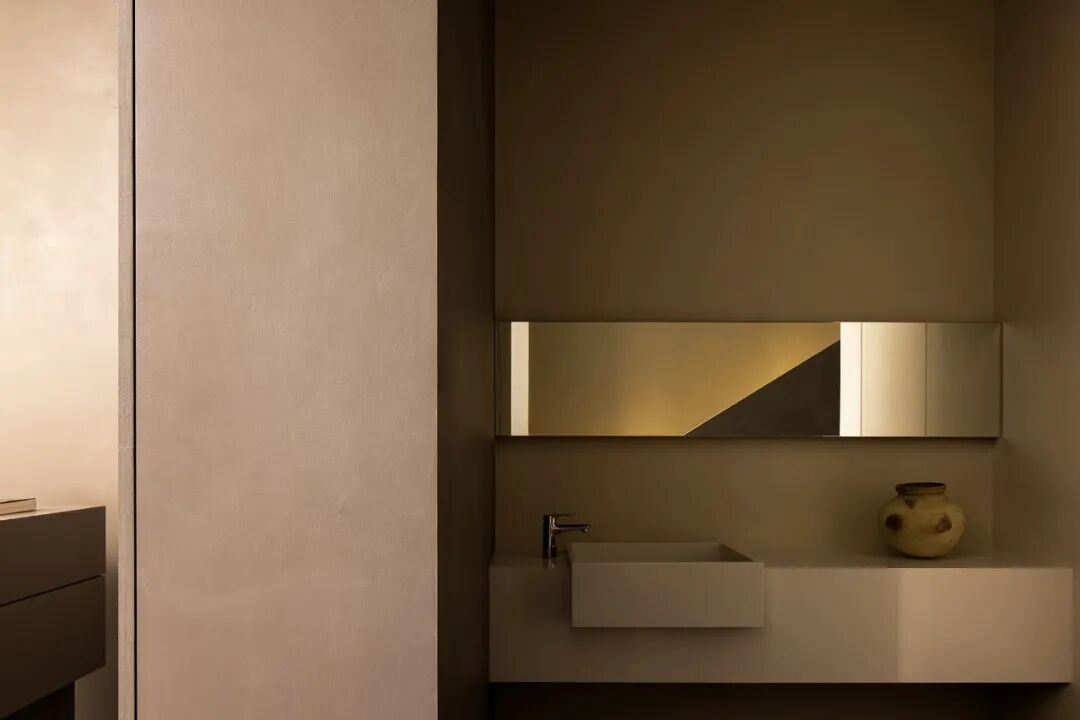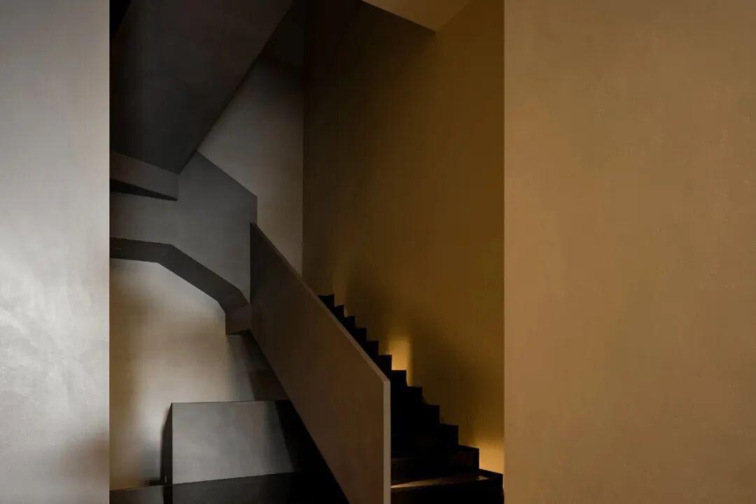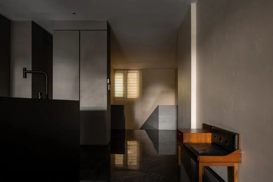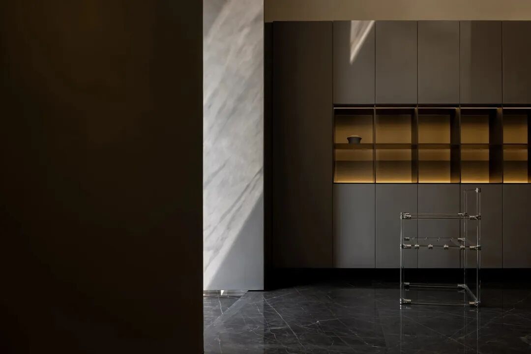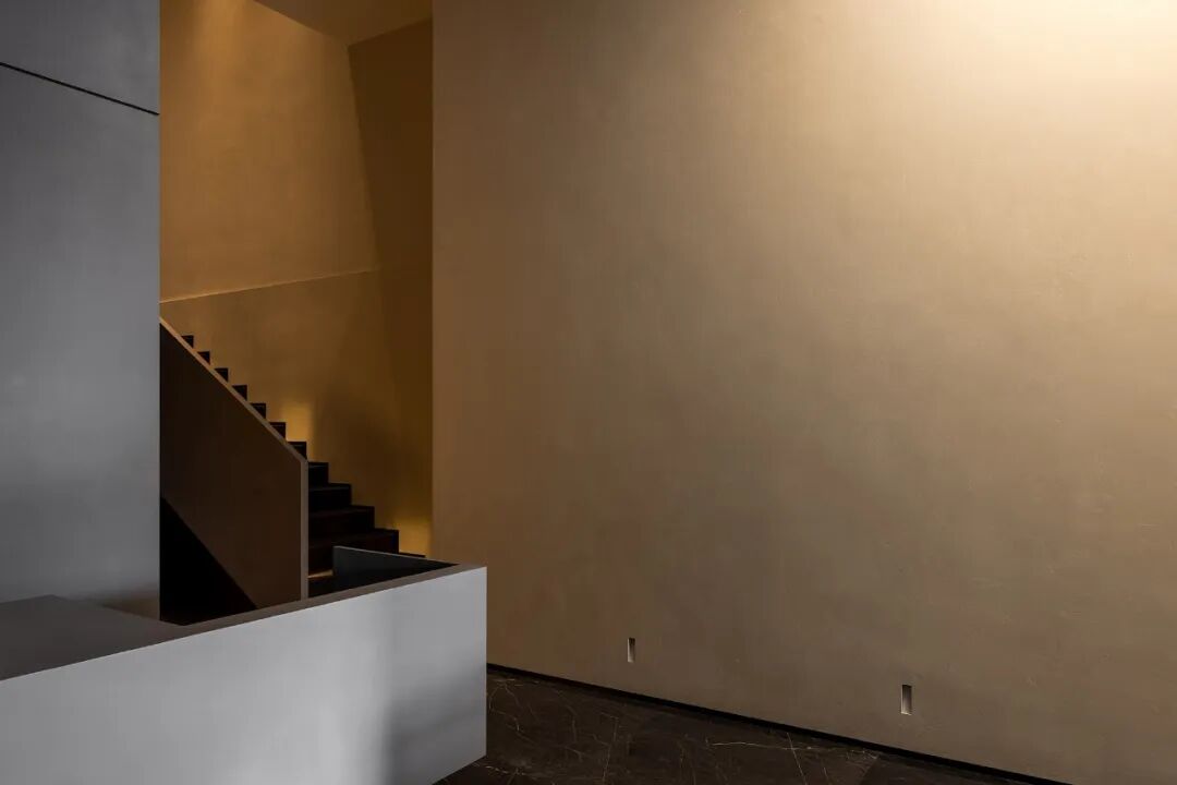 Walls clad in stone-texture paint contrast with the metal materials, injecting a sense of luxury into the comfortable space. Soft light accentuates the sense of weight in the space. The "floating" blocks strike a balance between heaviness and lightness, adding fun to the space.
