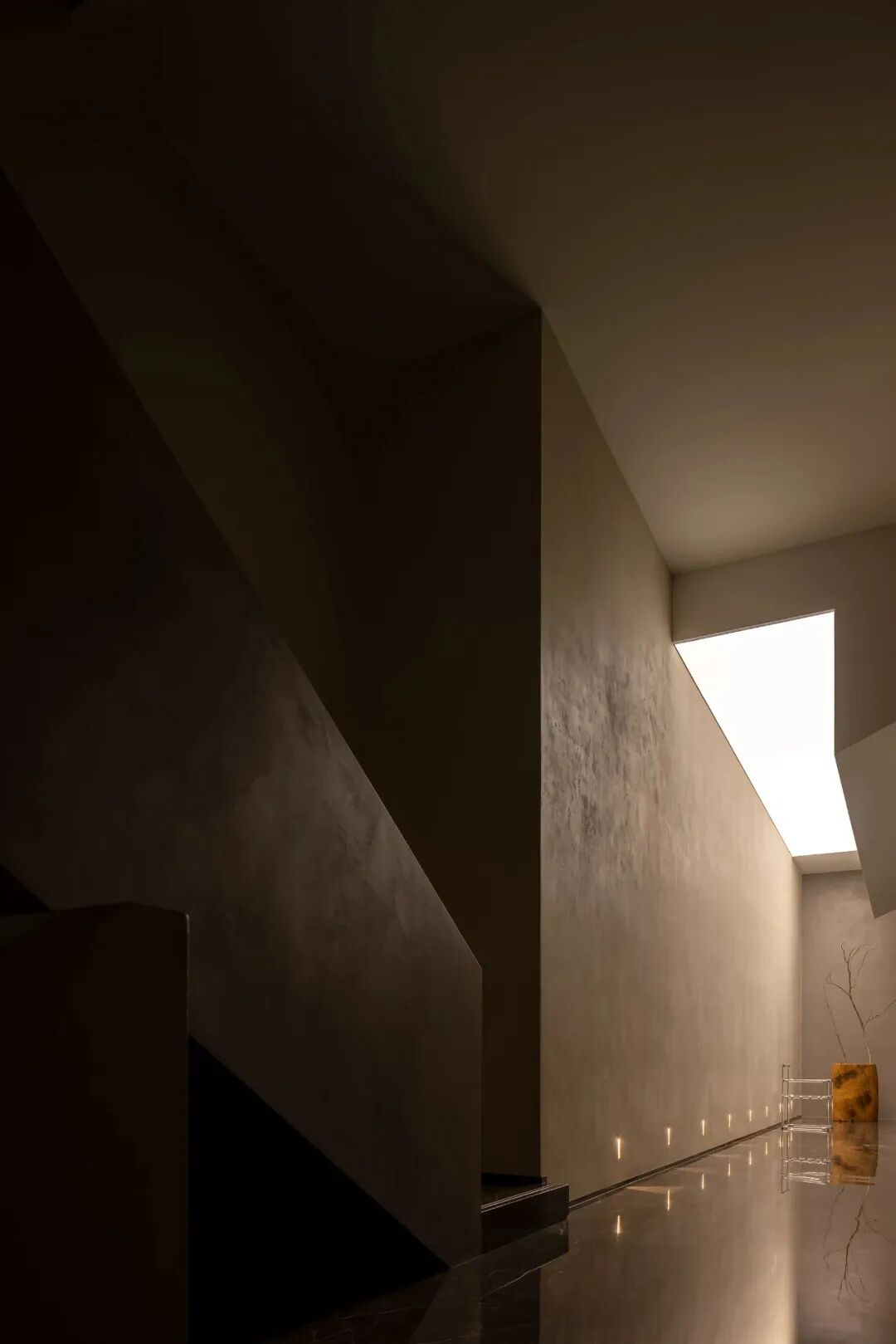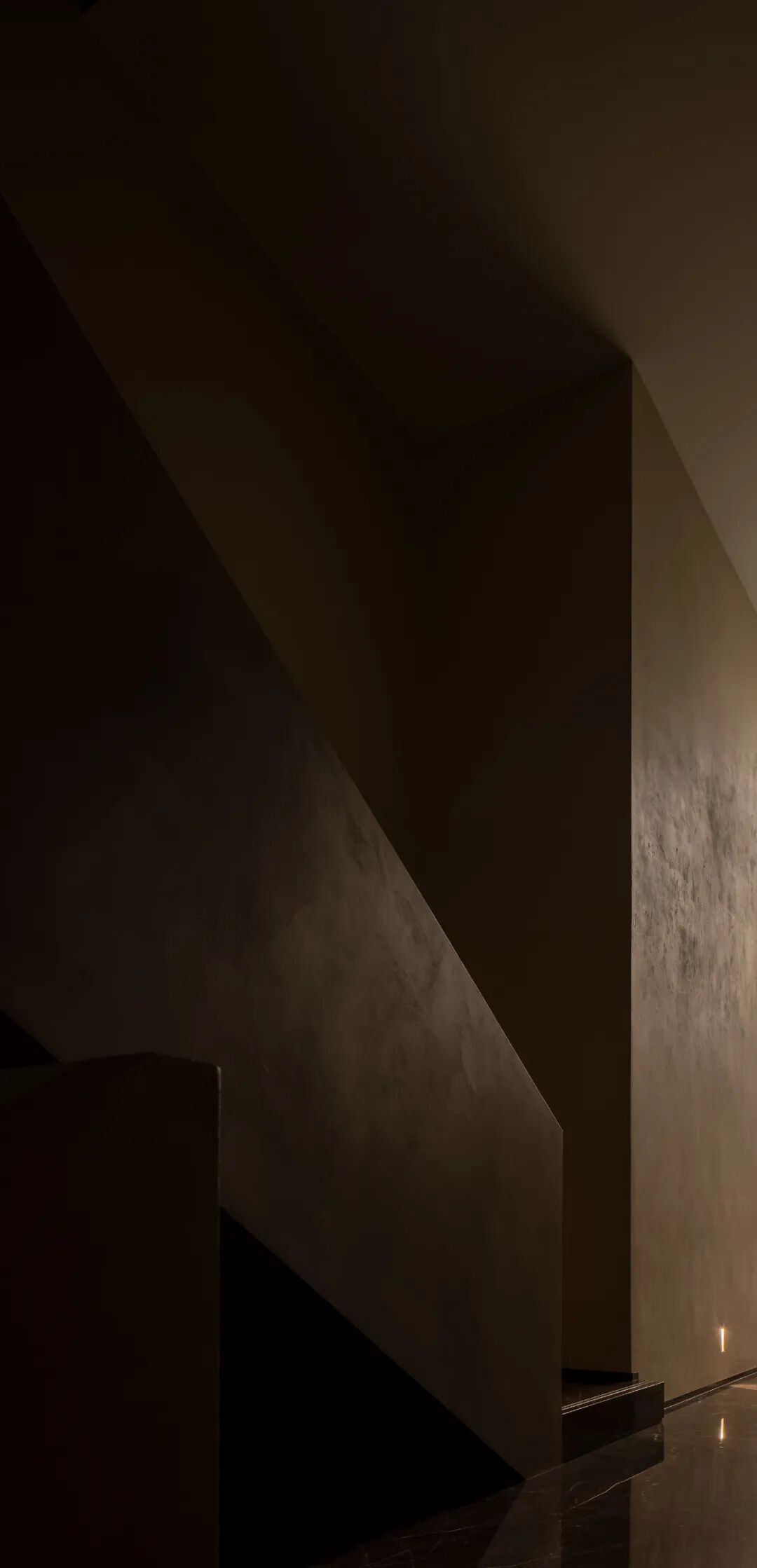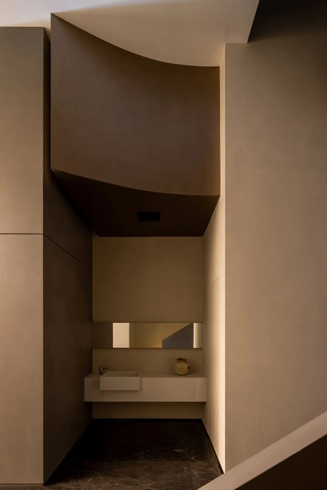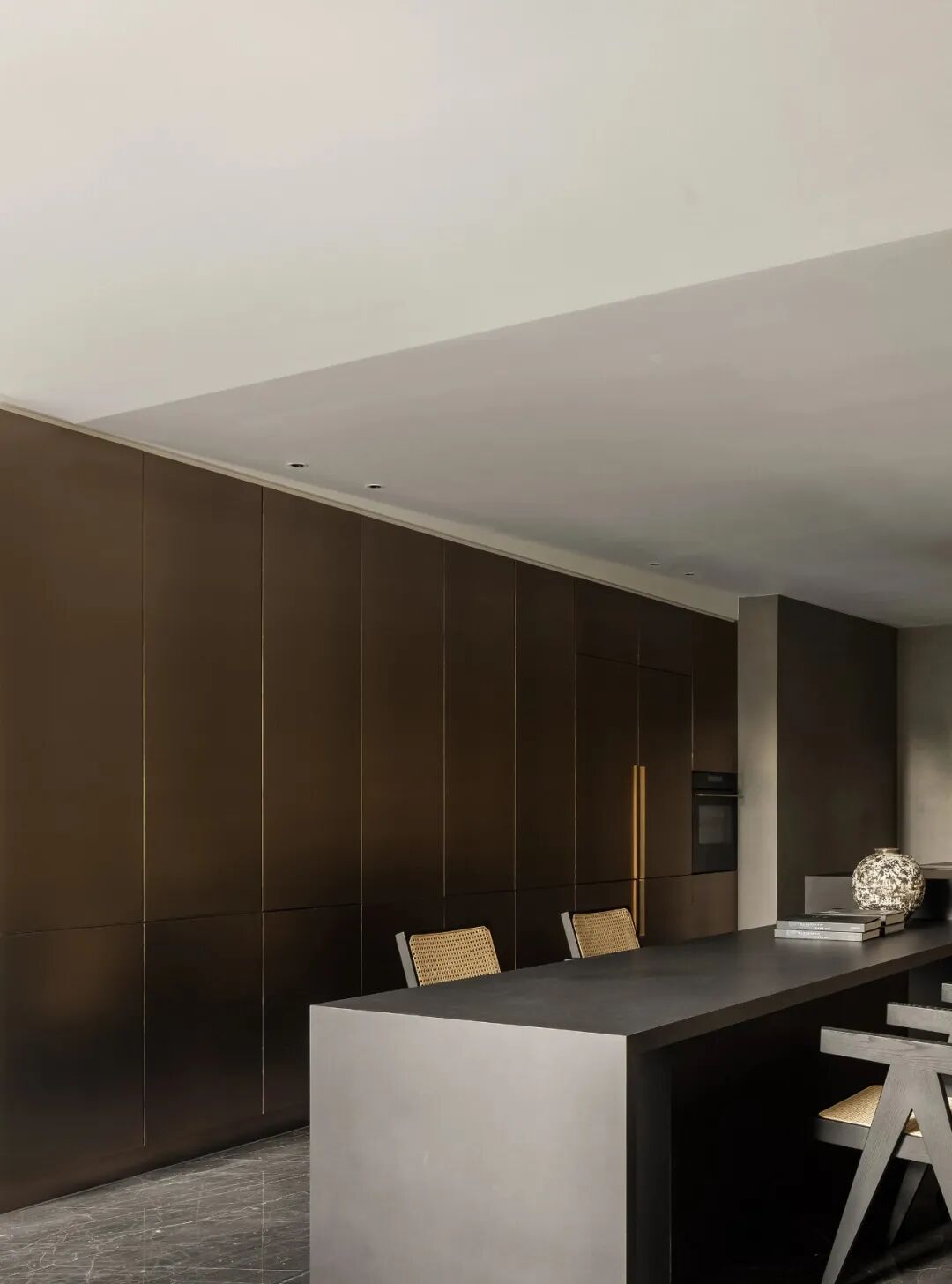 Walls clad in stone-texture paint contrast with the metal materials, injecting a sense of luxury into the comfortable space. Soft light accentuates the sense of weight in the space. The "floating" blocks strike a balance between heaviness and lightness, adding fun to the space.