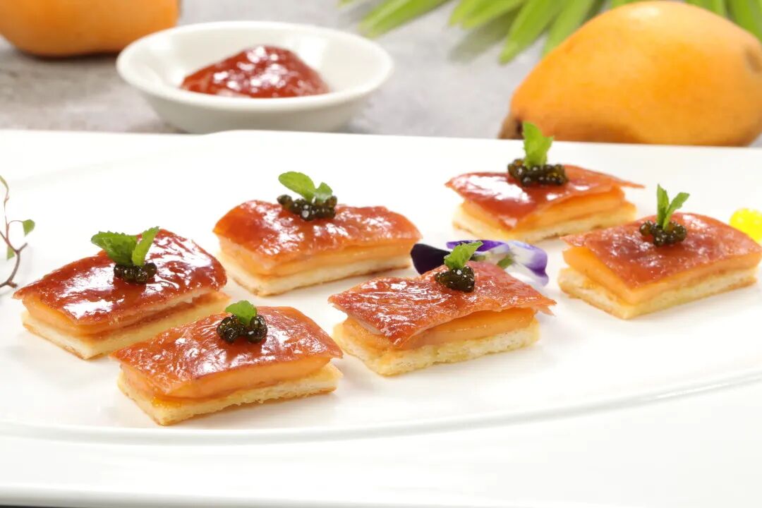 厦门艾美酒店乐美中餐厅的鱼籽酱枇杷果木烤鸭,在传统老北京烤鸭中增加了鱼子酱以和时令鲜果 - 枇杷,提鲜口感,玩转味蕾新花样;