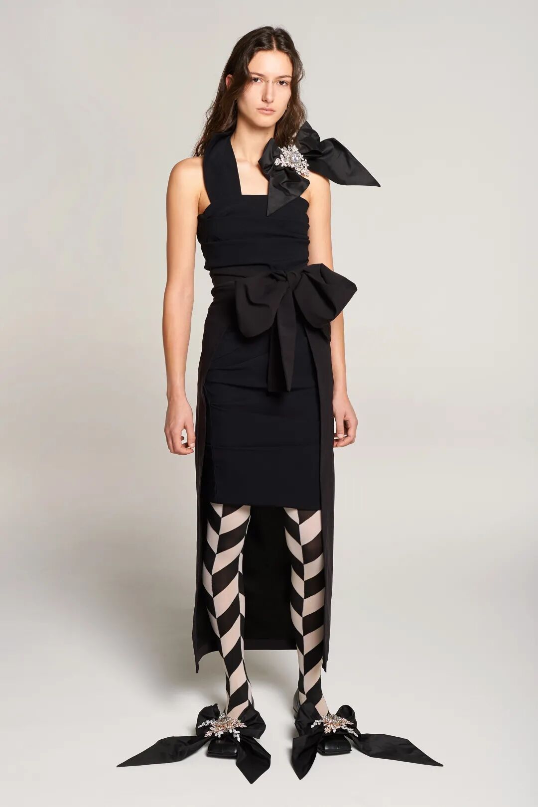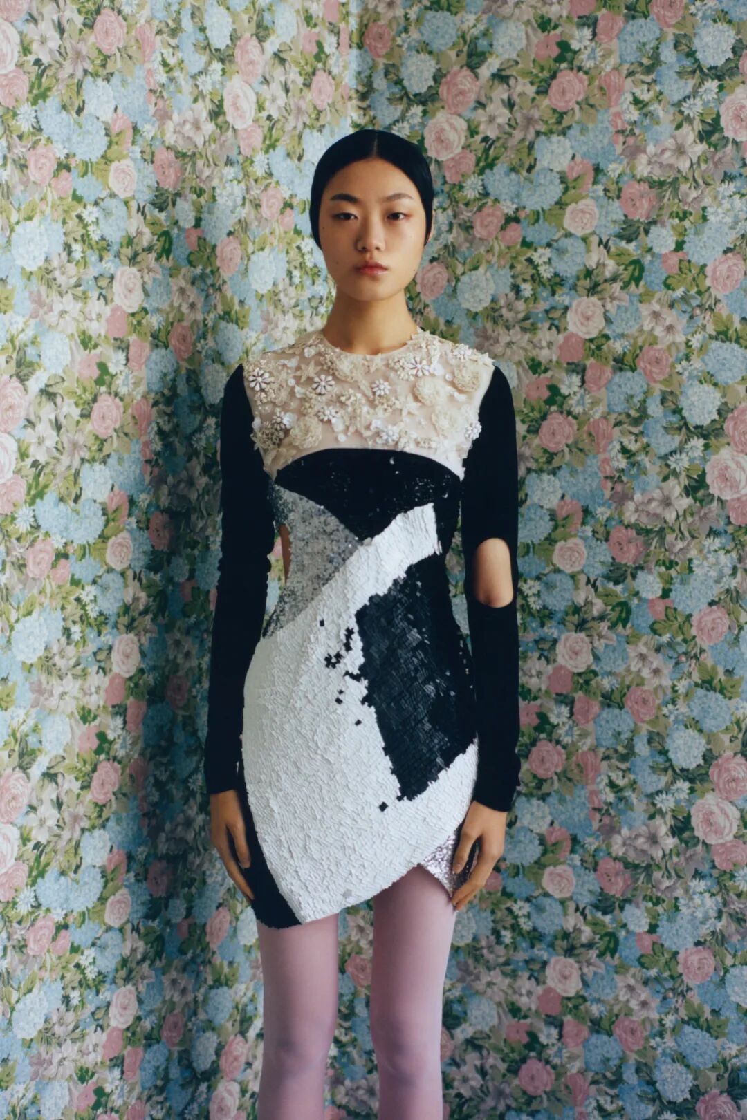 Preen By Thornton Bregazzi用上一季的残片拼接制作成连衣裙,粗犷的条纹和不匹配的花朵交织在一起。黑白的上衣搭配修长及膝的短裙、不同的绉纱运动衫拼贴像极了阿拉伯式的舞者服装。