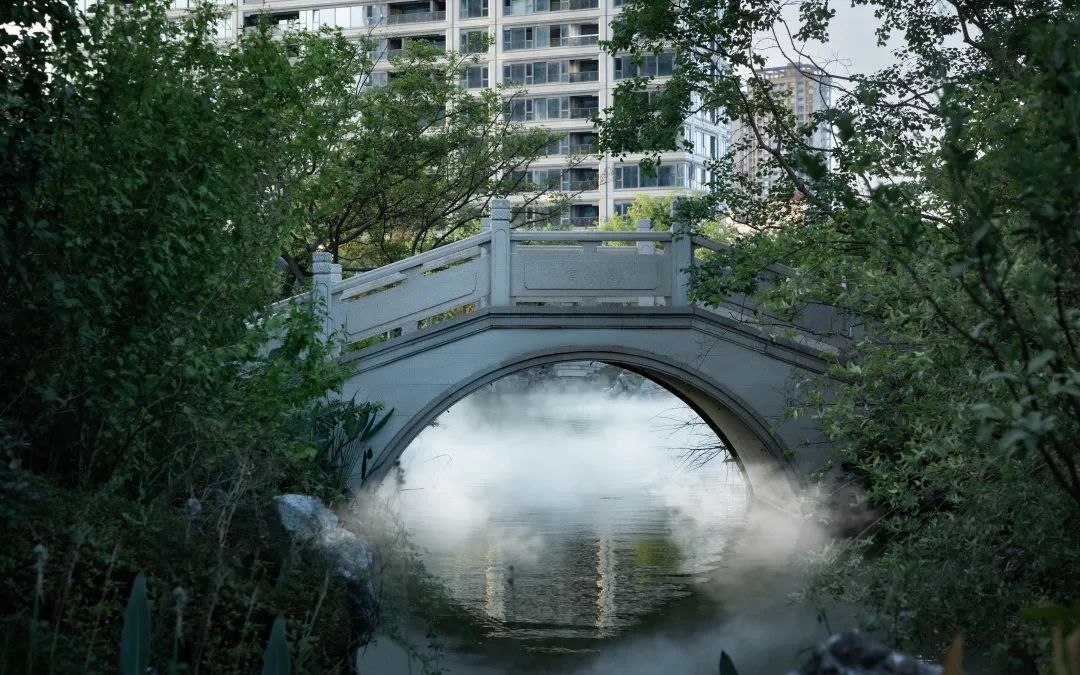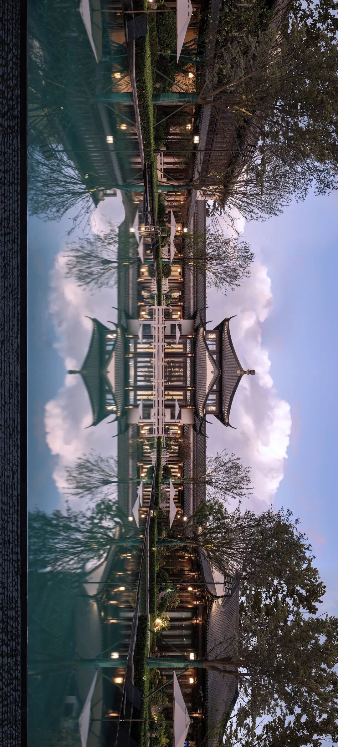 云水桥若隐若现驾于水面之上,设计师将想象中的诗文投射至空间,打开诗意、和谐、自然的视野,感受自然闲适的交融,空间的意境与高级感被娓娓道出。