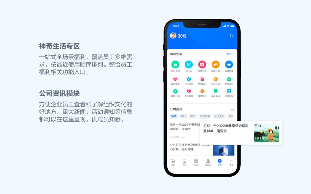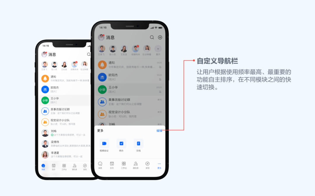 触达1:从早期单纯的IM沟通工具,美事不断集成公司各类协作应用(例如:日历、待办、文档、视频会议、直播等),变身为多工具、多业务的数据互通的一体化的协同办公平台。从“工具”到“平台”,我们将原来的“应用中心”升级为“全新工作台”。新版工作台涵盖协同办公领域数种功能,真正实现了企业内部各业务的高效协同。在视觉上,我们对100+应用图标进行了重绘,在保留延续性的同时让他们更符合界面场景。