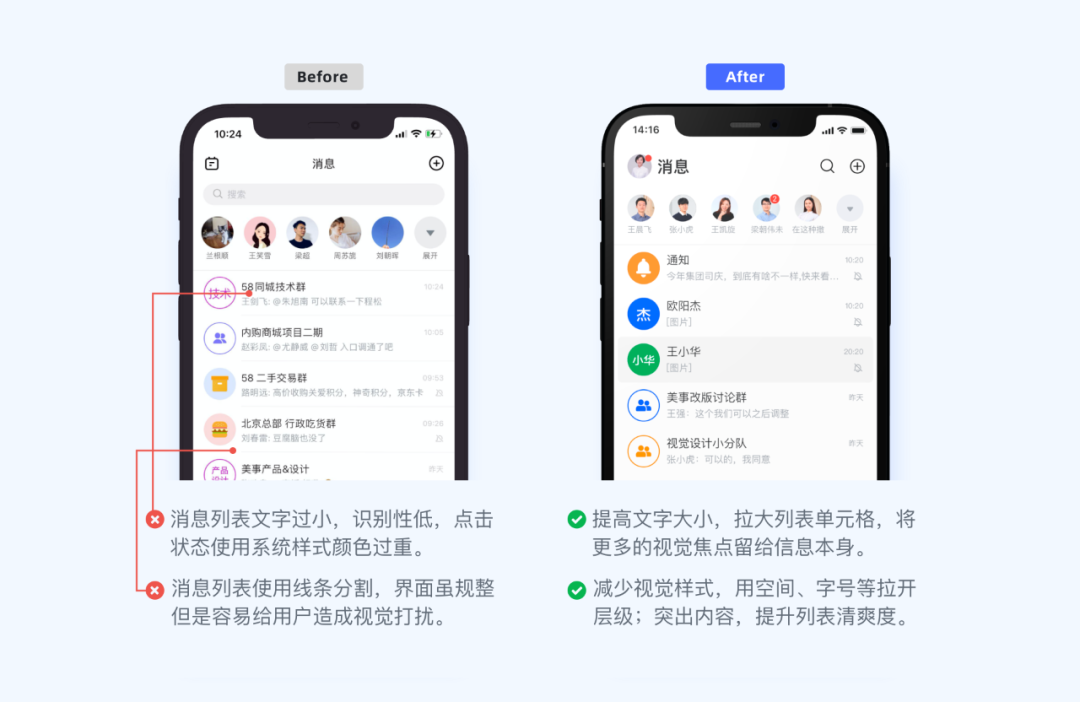 提高消息列表清爽度:通过提高文字梯度、降级辅助文字灰度,弱化分割线颜色等手段提高用户办公场景下的阅读体验,使关键信息更突出,便于用户快速阅读和信息速览。