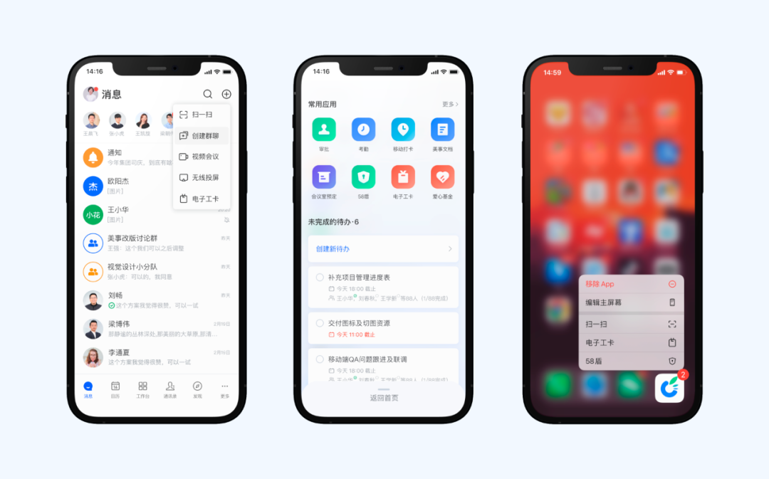 触达2:通过工具的变革,提升员工工作效率,让企业运转的更流畅。在新版设计中,用户打开APP不用切换导航栏,即可从消息页进入所有核心入口。另外,下拉二楼与待办系统进行了数据打通,“今日待办”让用户快速了解今日重要事。消息页加号、下拉二楼、3Dtouch等多人口的加入,满足用户的各种使用习惯。