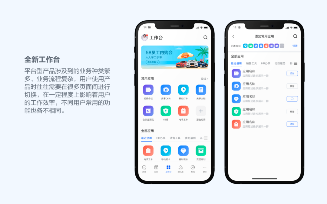 美事作为58集团内部线上办公软件,上线距今已经5年有余。在近两年疫情的影响下,随着线上办公、线上协同的诉求增加,旧版美事的诸多问题逐渐显现。为了给用户带来更好的使用体验,58UXD和企业平台部推动了本次改版设计。