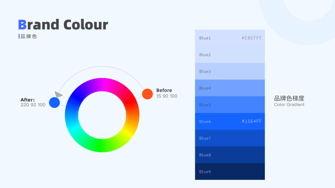 旧版美事的品牌色为橙色,寓意:友善,温暖,充满活力。从最早以内部沟通为核心功能的产品,到如今的在线协同办公平台,随着业务不断扩张和发展,我们的用户往往每天都要长时间使用我们的产品,大面积的橙色占比往往使用户更易疲劳。品牌色升级,从暖色系回归冷色系,只为向我们的用户传达:高效、安全、稳定、可信任的产品使用感受。