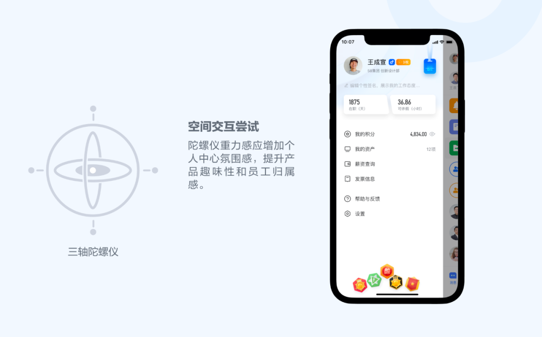新版的个人中心与美事勋章系统进行了数据打通,交互方式借助手机陀螺仪功能,通过手机扭转移动,勋章会在X轴水平位移滚动。此功能的设计,给用户提供趣味性体验,提升用户心智,增加品牌传播。另外新版电子工卡功能做了精细化打磨,加入了动效隐喻提高了视觉层级,增强了用户点击欲。