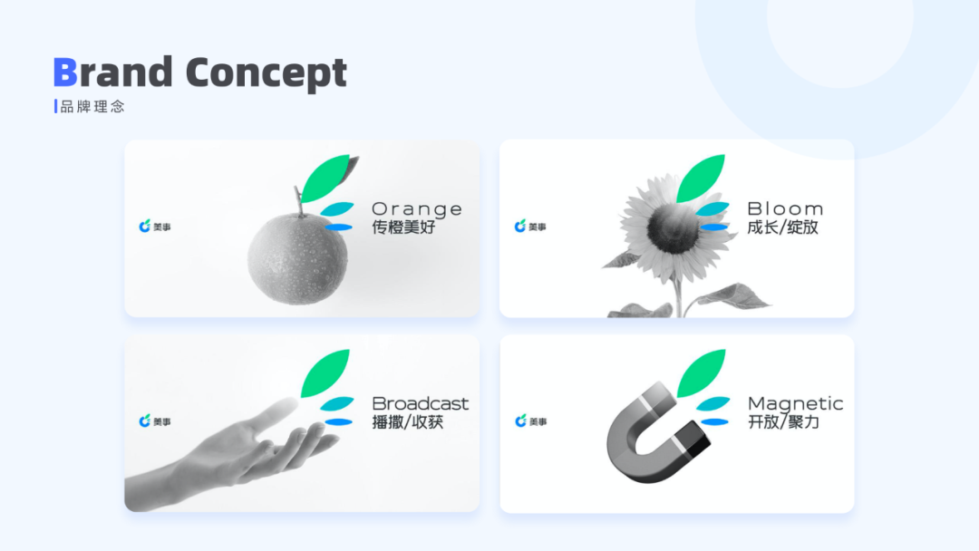 每一个品牌升级都不可避免的从重绘 logo 开始。对于58员工而言,美事有着让人印象深刻的橙子造型,所以我们保留这一份视觉”记忆“,希望可以延续用户对美事最直接的品牌认知。我们在创意上保持克制的同时,将新的品牌心智注入进品牌形象中,结合“传橙 收获 成长 开放 ”的新愿景,进行logo的抽象化设计表达。