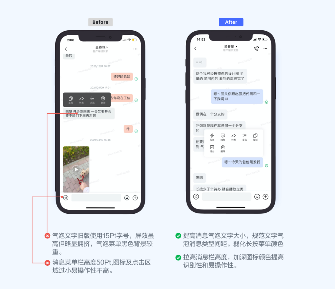 加大消息气泡、文字字号,拉高底部输入栏高度,强化icon颜色纯度,提高用户沟通场景界面的清爽度。