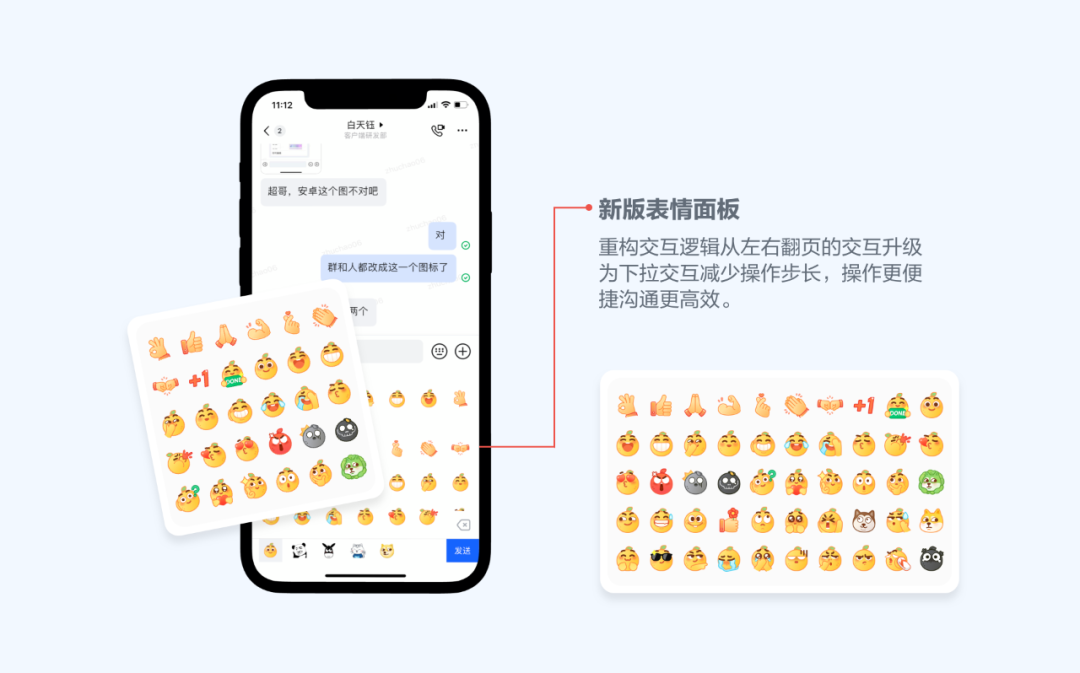 提升协同效率从愉悦沟通开始!人是要被鼓励的,文档的一个点赞或者在聊天中一个鼓掌的表情都会让你在日复一日的平凡工作中感受到自己的价值。美事6.0新表情与品牌因子进行了融合,并针对办公场景设计了全新emoji表情,只为用户沟通更愉悦。另外我们对表情面板进行了优化,交互逻辑从左右翻页升级为下拉滚动,减少了操作步长,提高了查找速度