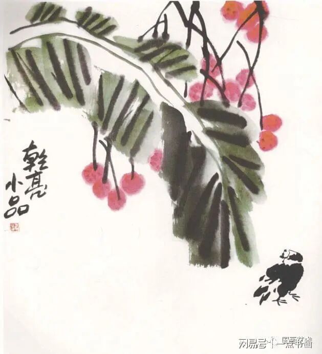 整幅画作都是用中锋勾描外形,后用色墨点染。