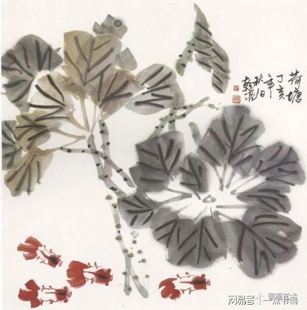 前面的荷叶用草绿、墨、水泼洒,淋淋漓漓,一遍泼过。笔简而整,形在意中。落笔要大胆谨慎,使人有清新之感。